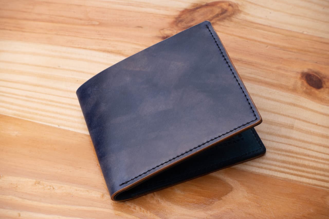 This is a special bifold wallet, with the outer layer made of blue Museum shell cordovan leather from the Rocado tannery in Italy.