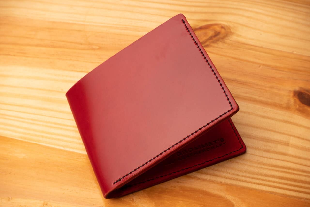 This is a special bifold wallet, with the outer layer made of red shell cordovan leather from the Shinki Hikaku tannery in Japan.