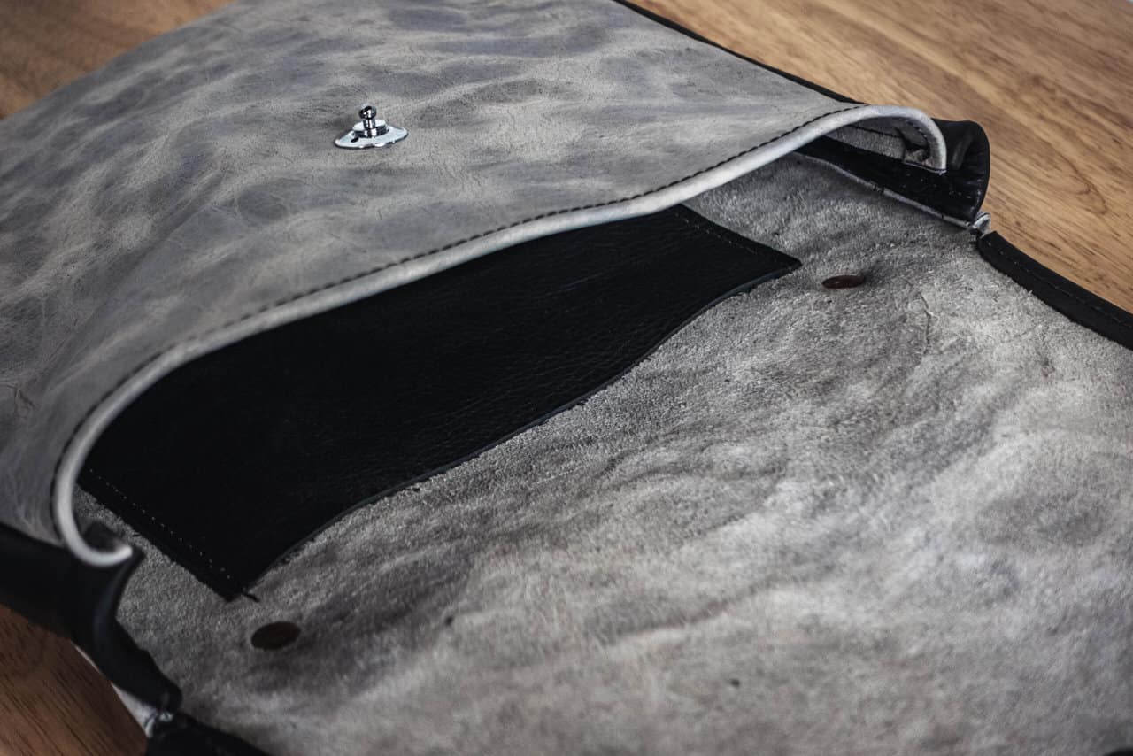 The bag has a generous black latigo strap that is adjustable via a black conway buckle. The bag is closed via a black Loxx fastener.