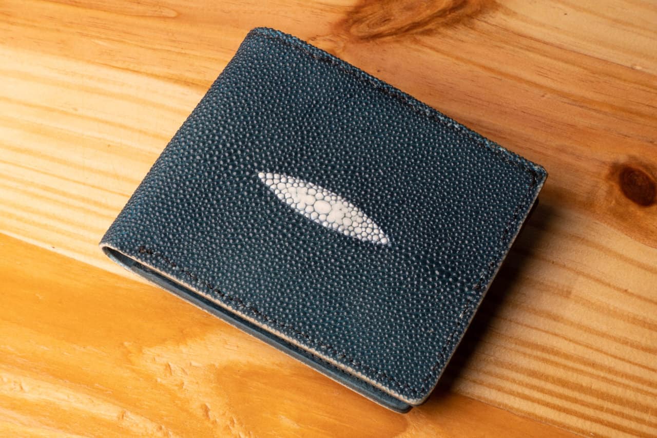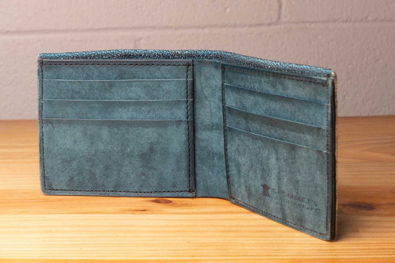 This is a special bifold wallet, with the outer layer made of a panel of light blue stingray leather.