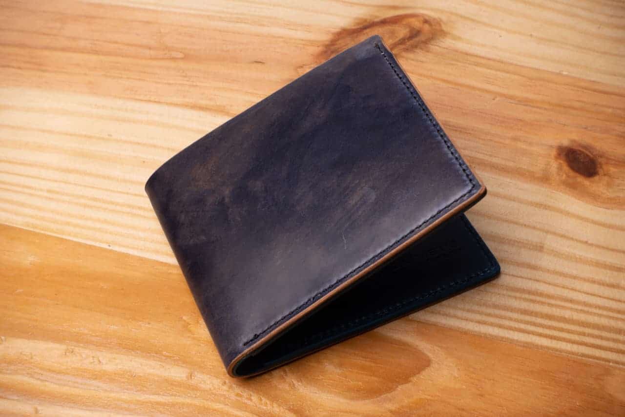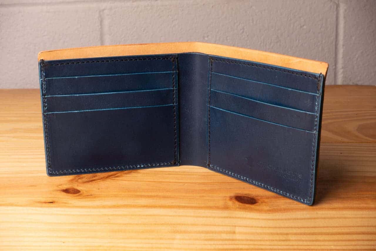 The interior of this wallet is made out of blue Buttero leather from the Walpier Conceria tannery in Italy.The entire wallet is hand burnished with tokonole to highlight the grain of the edge of both the cordovan and buttero leathers.