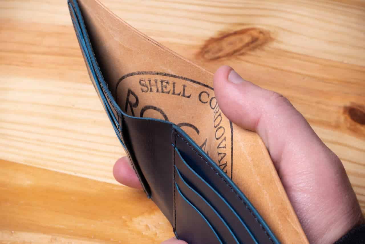This is a special bifold wallet, with the outer layer made of Blue Museum shell cordovan leather from the Rocado tannery in Italy. This wallet is especially unique, as it features the Rocado Stamp inside the cash pocket. There’s only one stamp per hide, so we have to be very particular about where we place it.