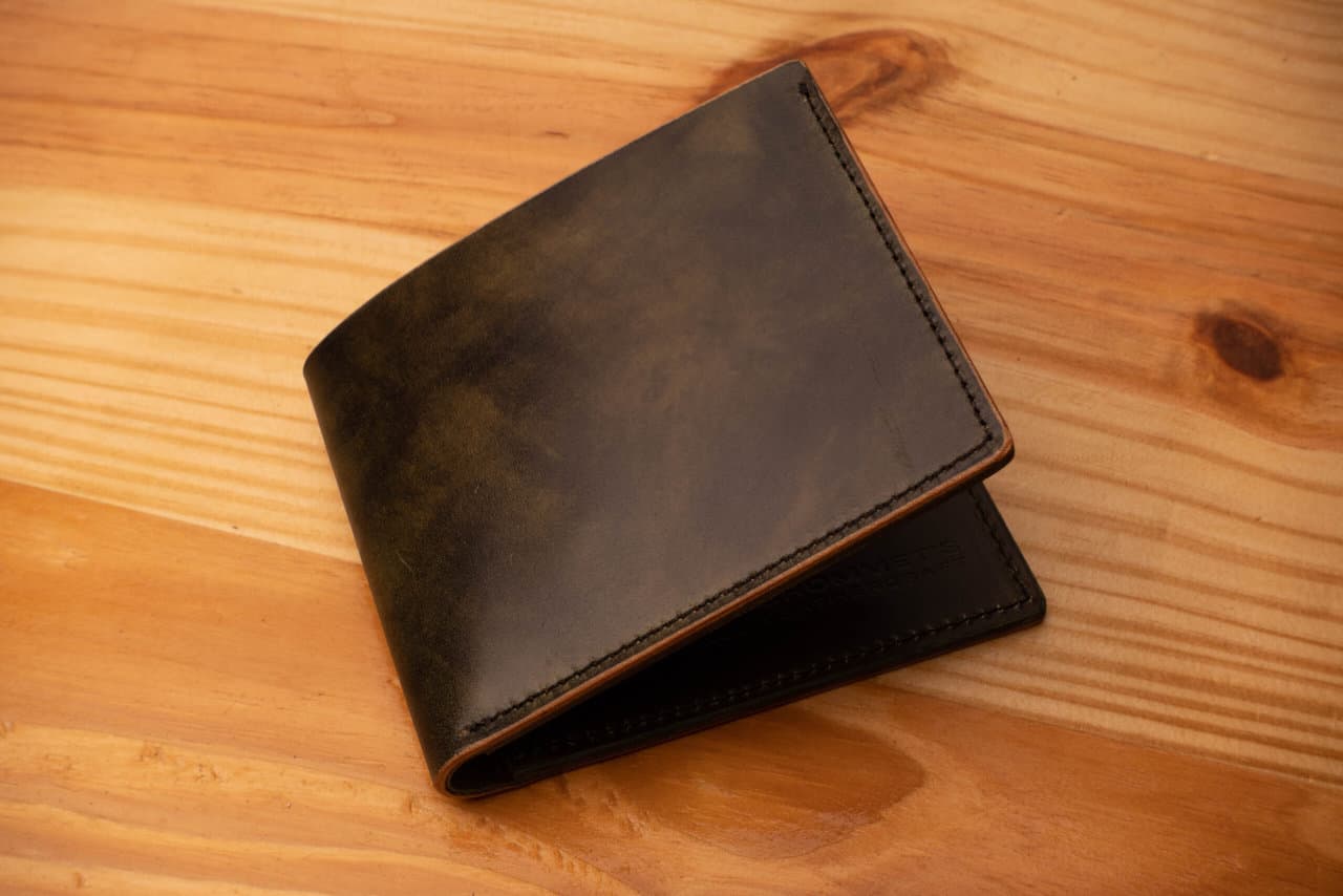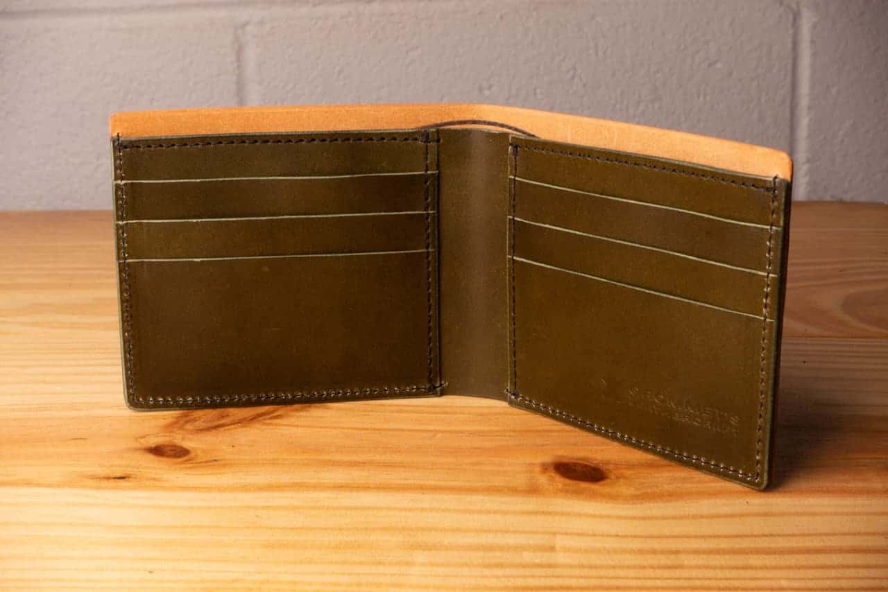 The interior of this wallet is made out of olive Buttero leather from the Walpier Conceria tannery in Italy.The entire wallet is hand burnished with tokonole to highlight the grain of the edge of both the cordovan and buttero leathers.