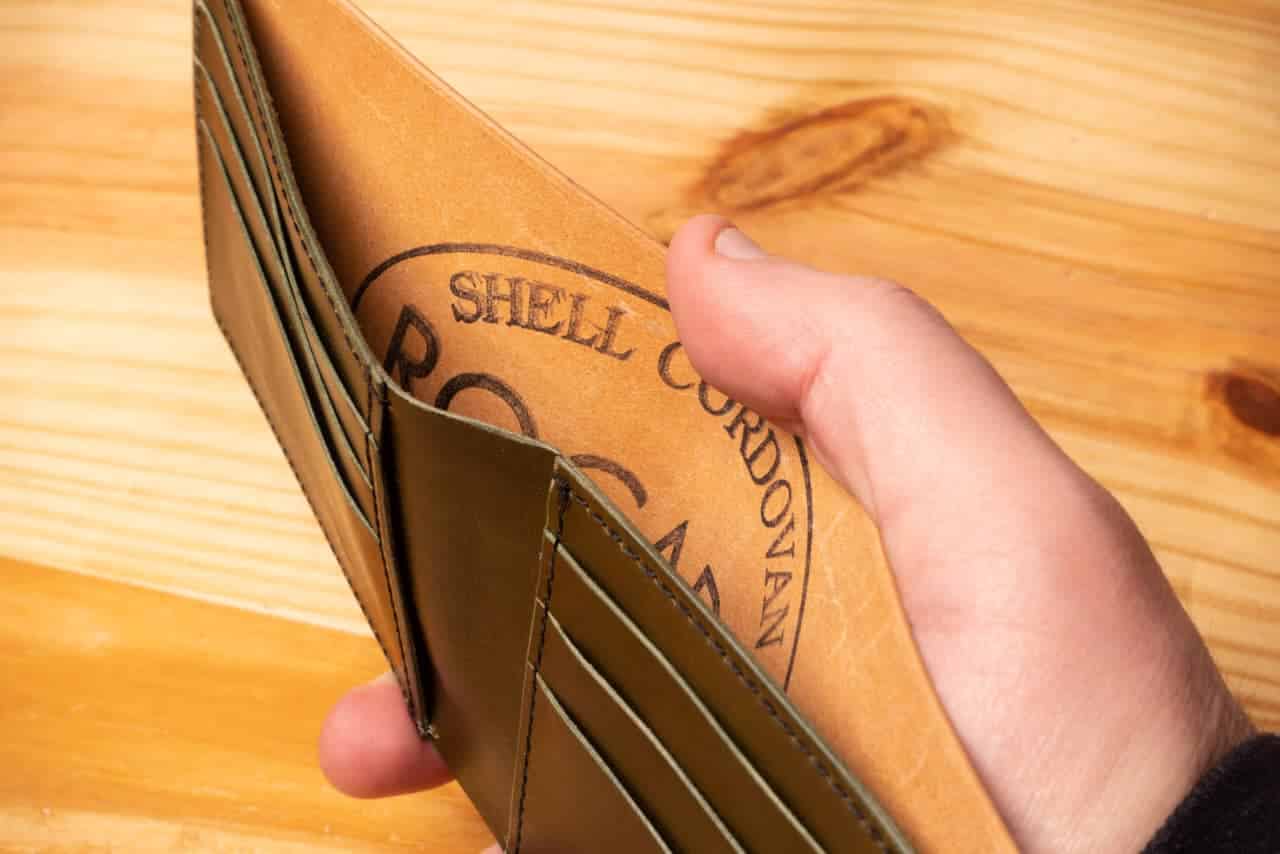 This is a special bifold wallet, with the outer layer made of green Museum shell cordovan leather from the Rocado tannery in Italy. This wallet is especially unique, as it features the Rocado Stamp inside the cash pocket. There’s only one stamp per hide, so we have to be very particular about where we place it.
