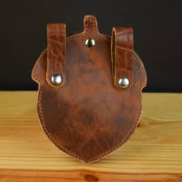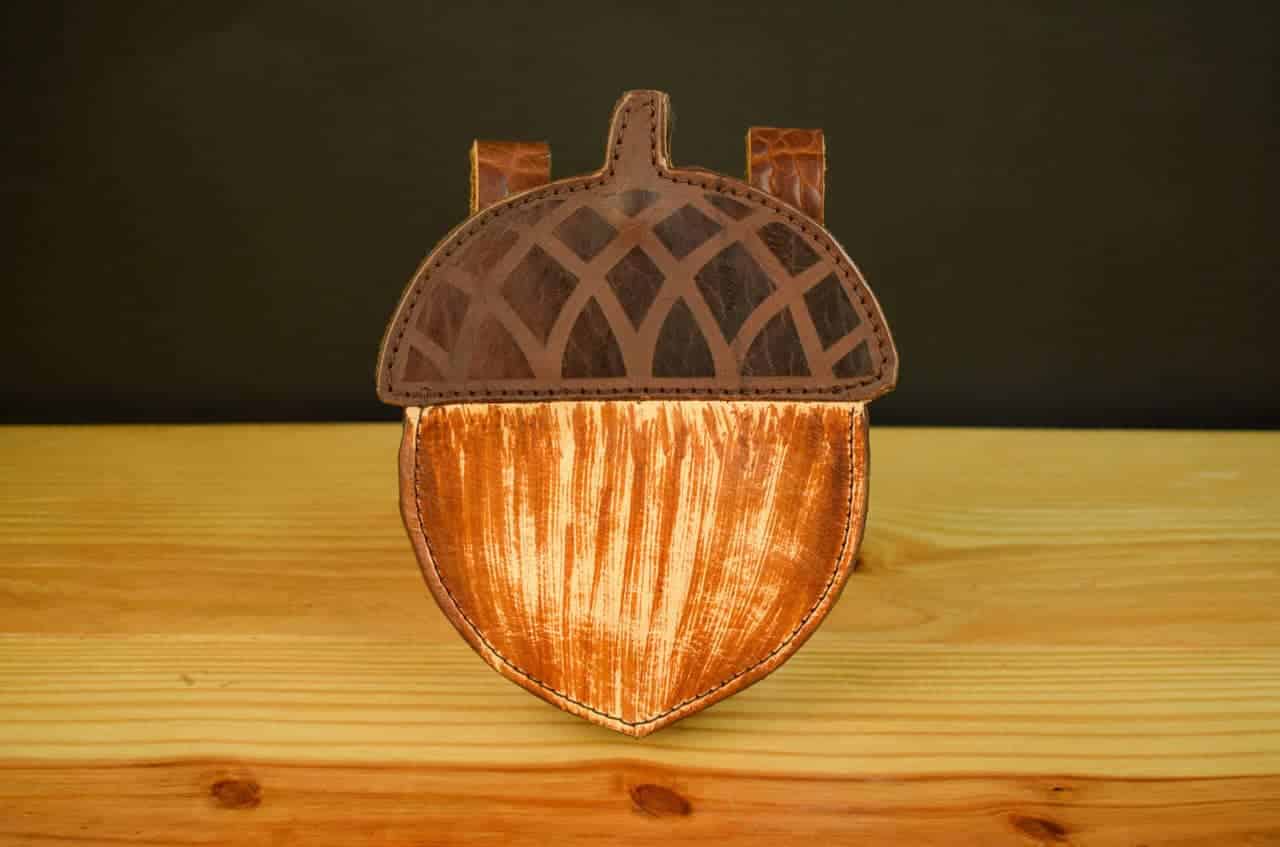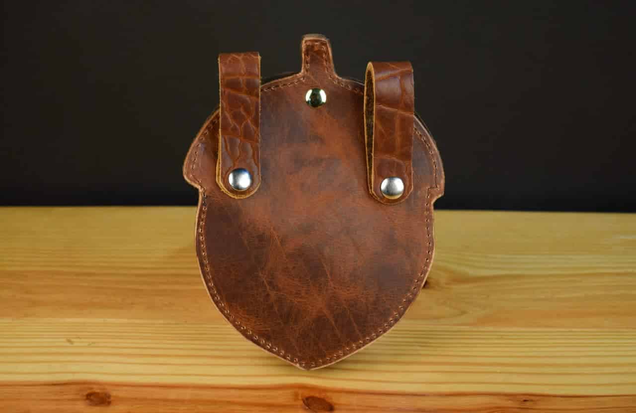 This is a handmade medieval style belt pouch, shaped like an acorn, with an open top and magnetic closure.
