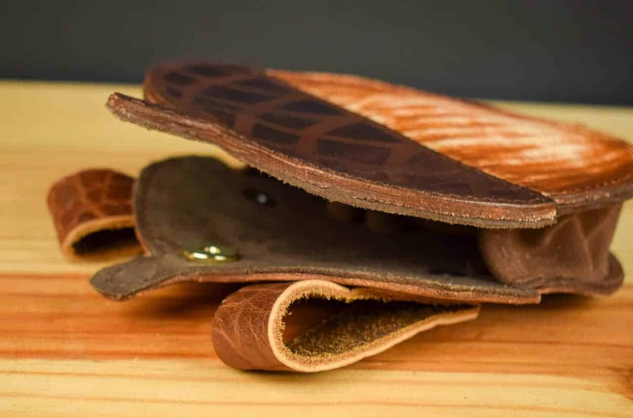 Each pouch is made out of hand dyed vegetable tanned leather, with a laser engraved bison leather top, dark brown suede lining and gusset