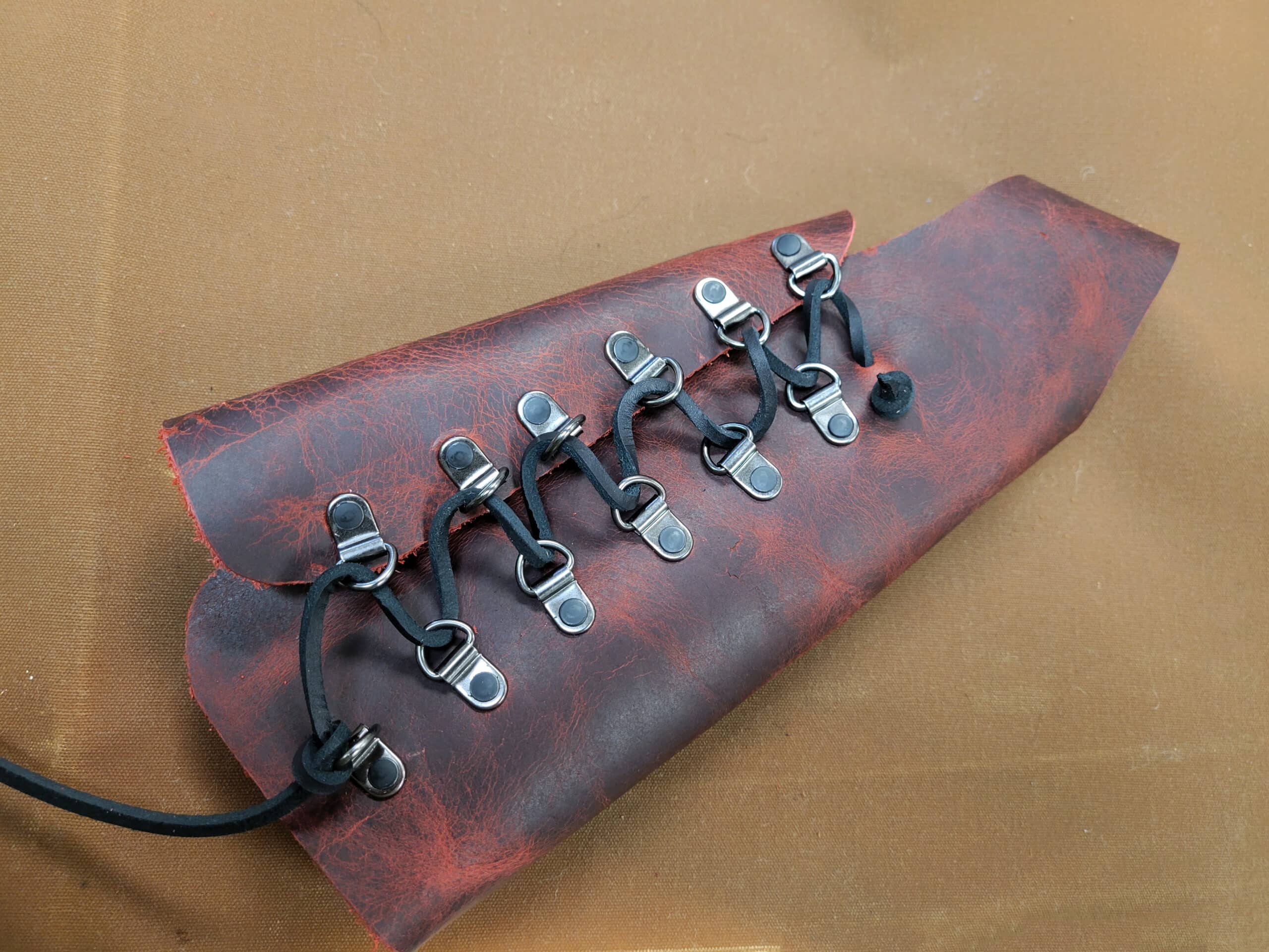 The top layer of the bracer is made of either 8-10 ounce latigo or vegetable tanned leather depending on the color you choose, and is hand stitched to the inner arm section of the bracer to protect against the bow string.