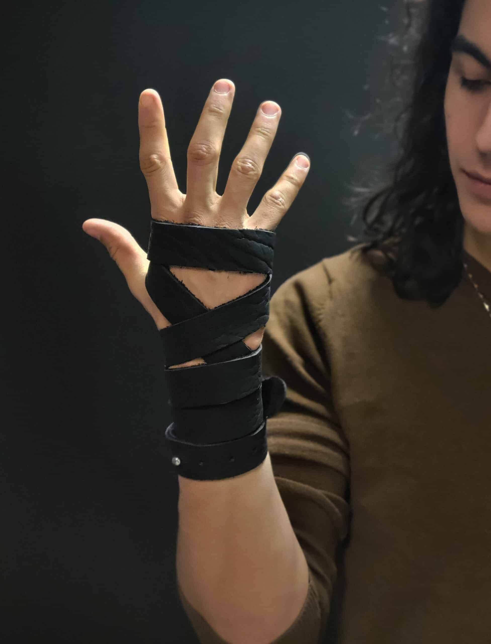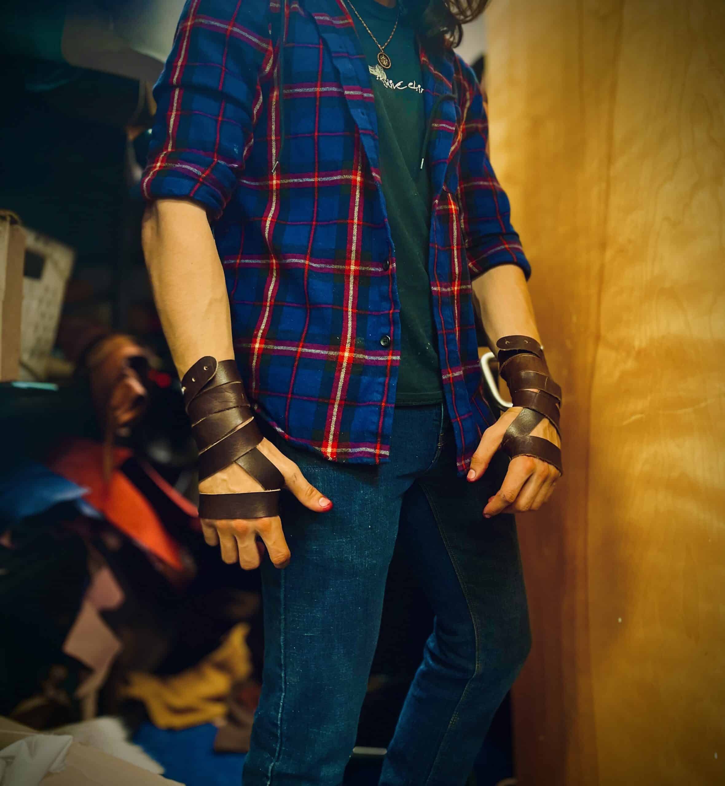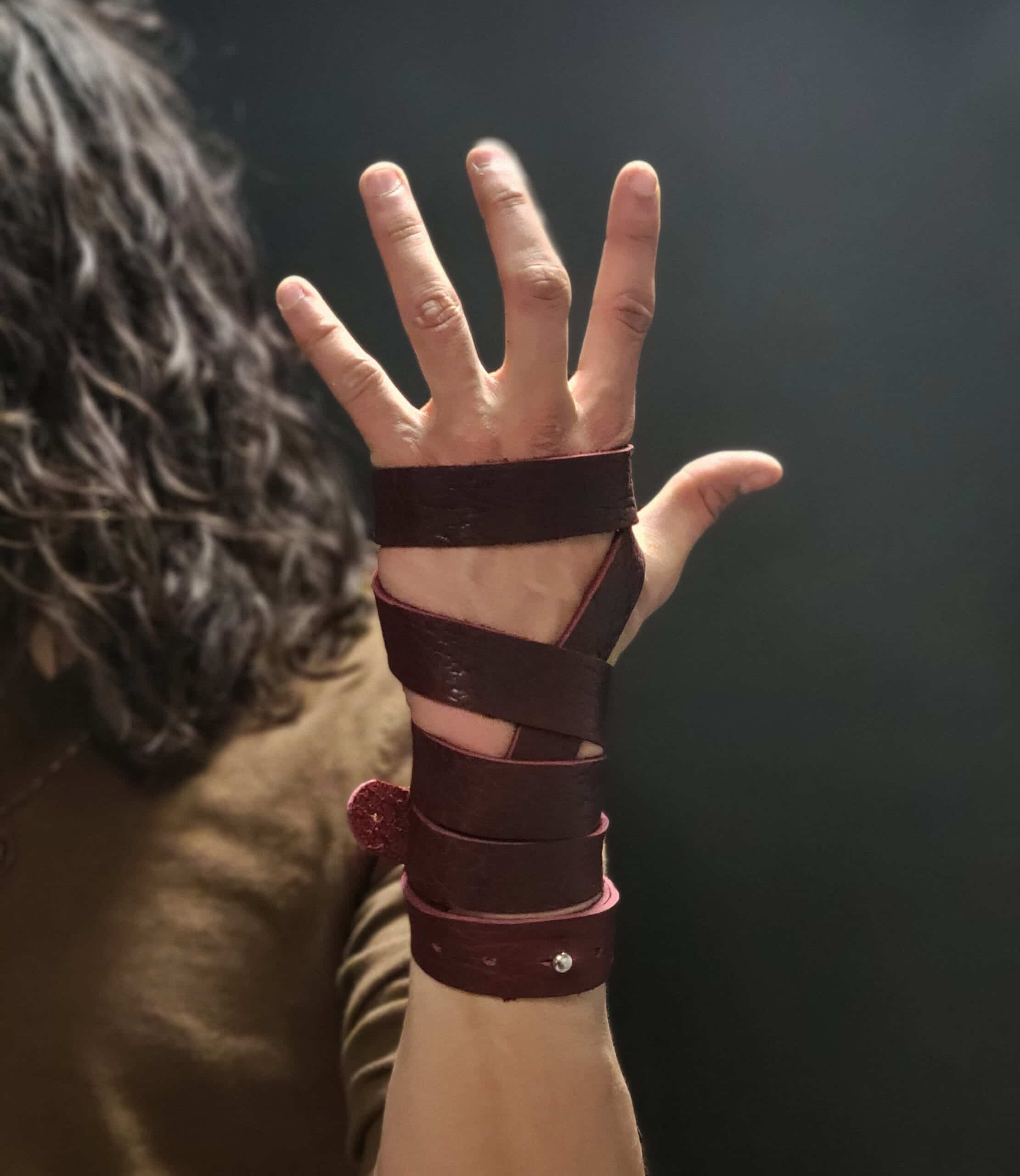 These are a set of simple wrap style bracelets/wrist wraps. Each pair of wraps is made out of 3-4 ounce bison leather, and clasped via a simple sam browne stud. Instructions are included for how we wrap ours, or you are free to experiment and find your own unique way.