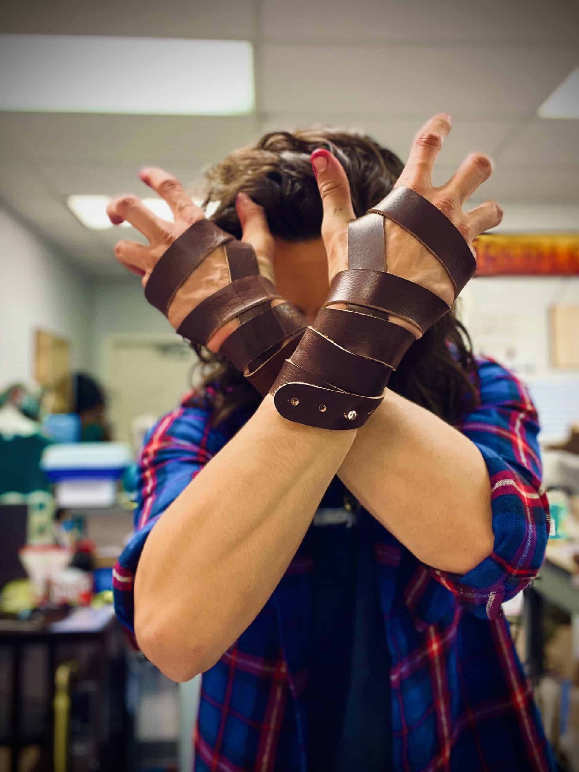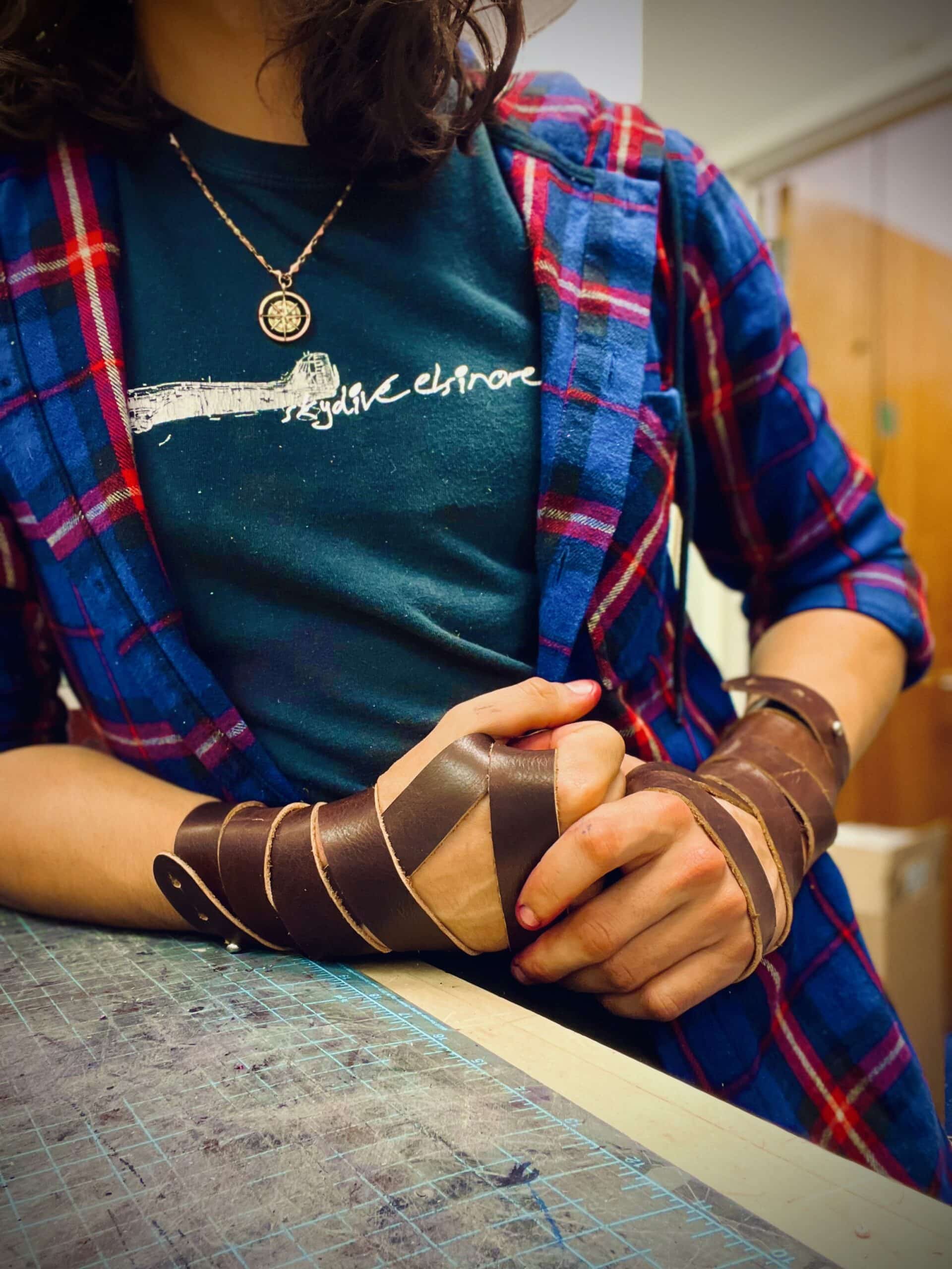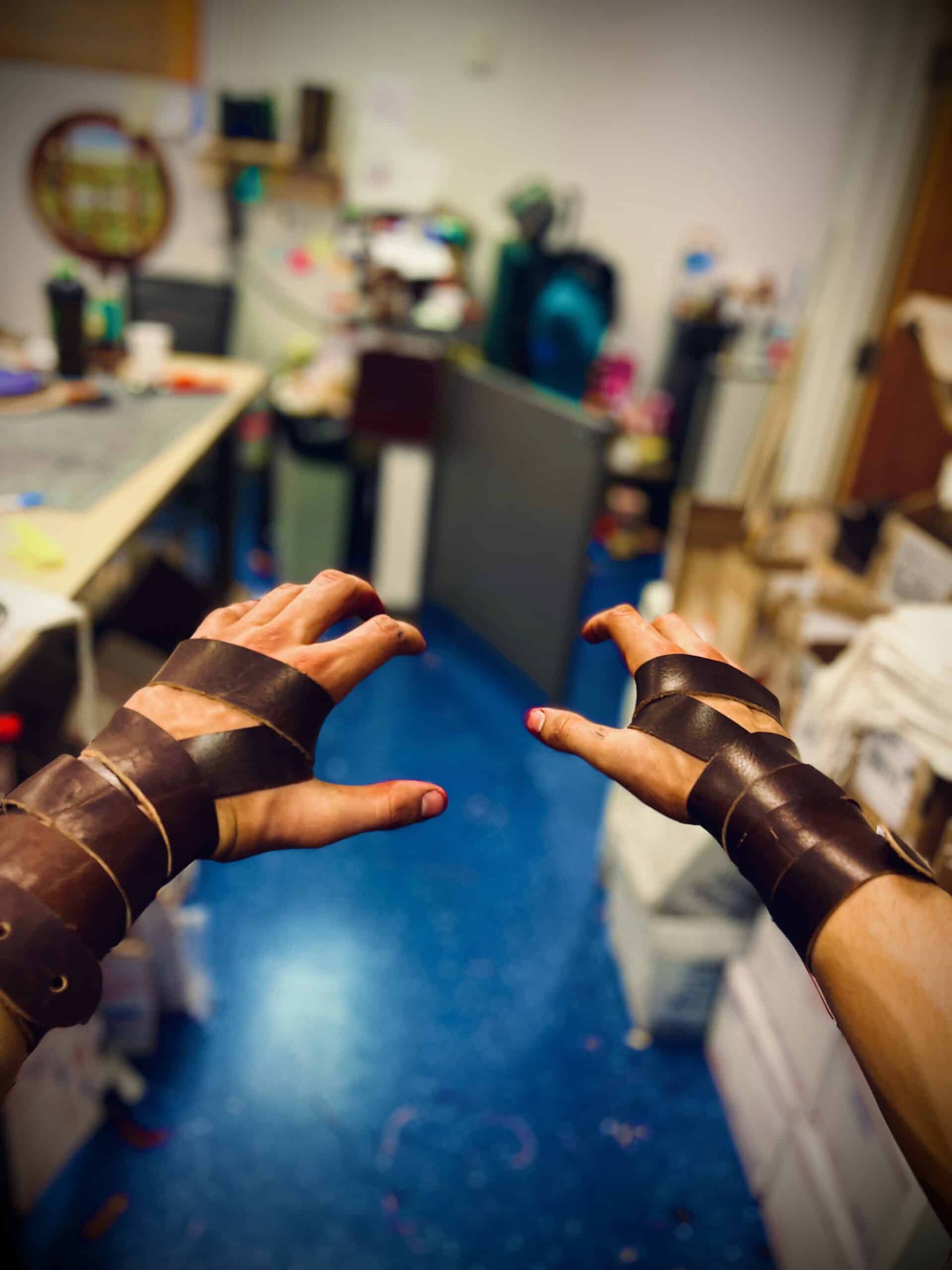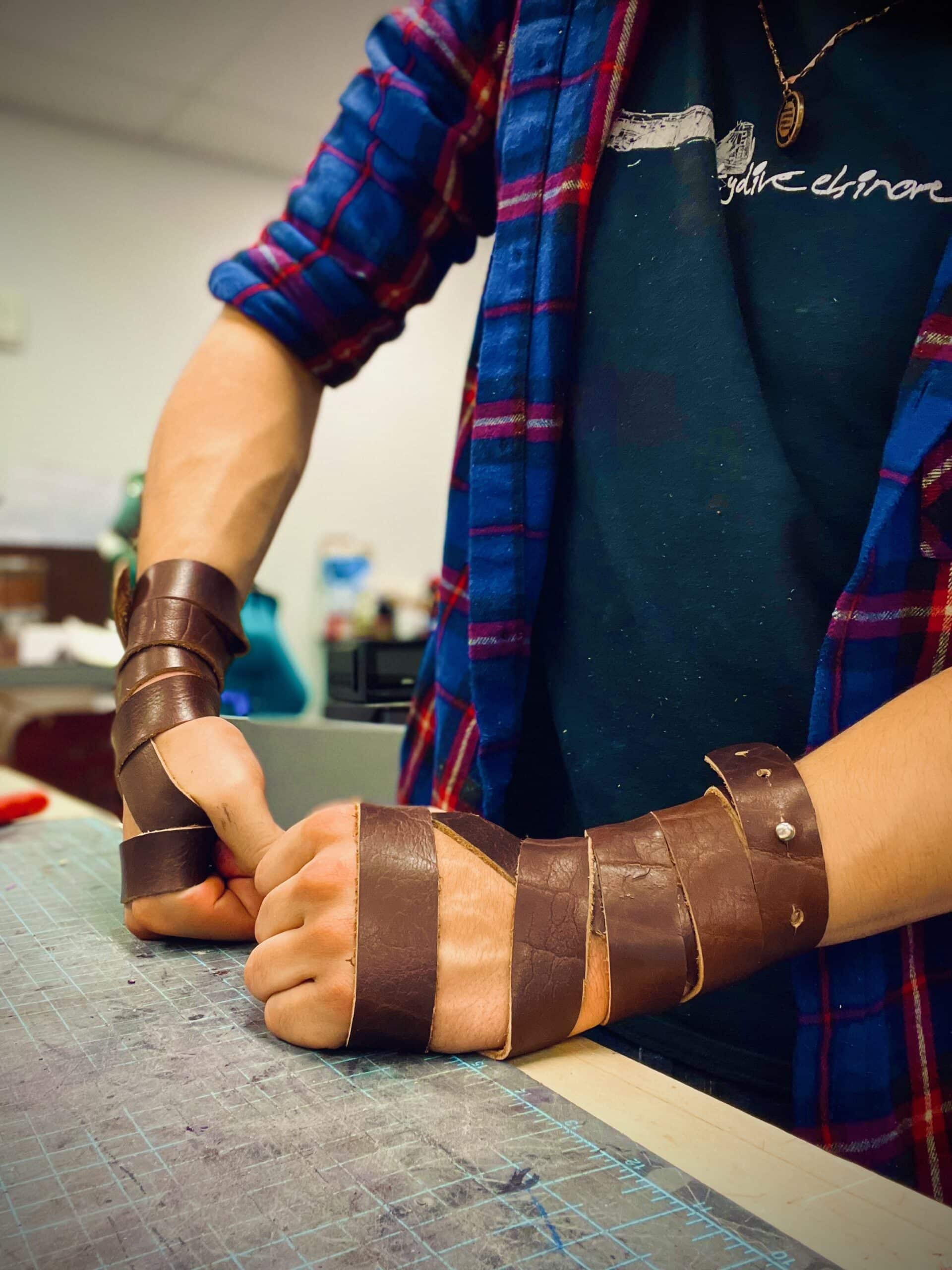 These are a set of simple wrap style bracelets/wrist wraps. Each pair of wraps is made out of 3-4 ounce bison leather, and clasped via a simple sam browne stud. Instructions are included for how we wrap ours, or you are free to experiment and find your own unique way.
