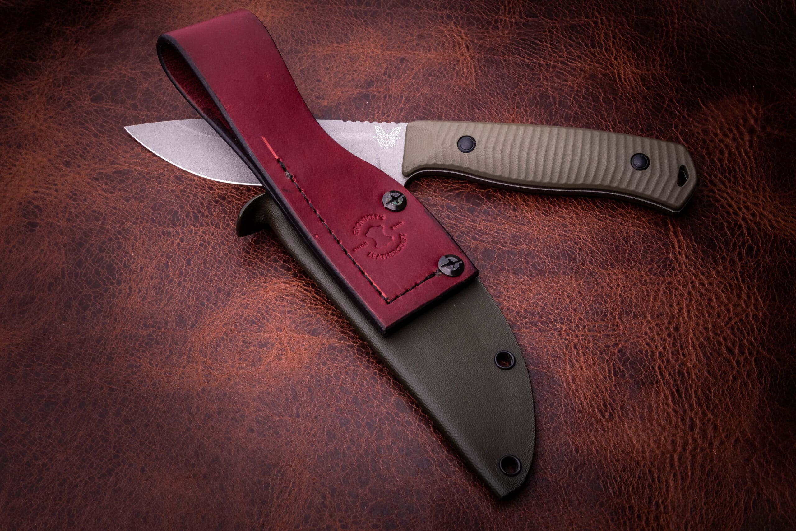 The sheath is an improvement over the plastic sheath that comes stock from Benchmade. It is available in a variety of colors and can be ordered with either a leather or kydex belt loop, and each option can be ordered with a retention strap that snaps around the handle to keep the knife from bouncing around. There is a thumb groove to assist in drawing the knife and a drain hole in the bottom to prevent fluid buildup.