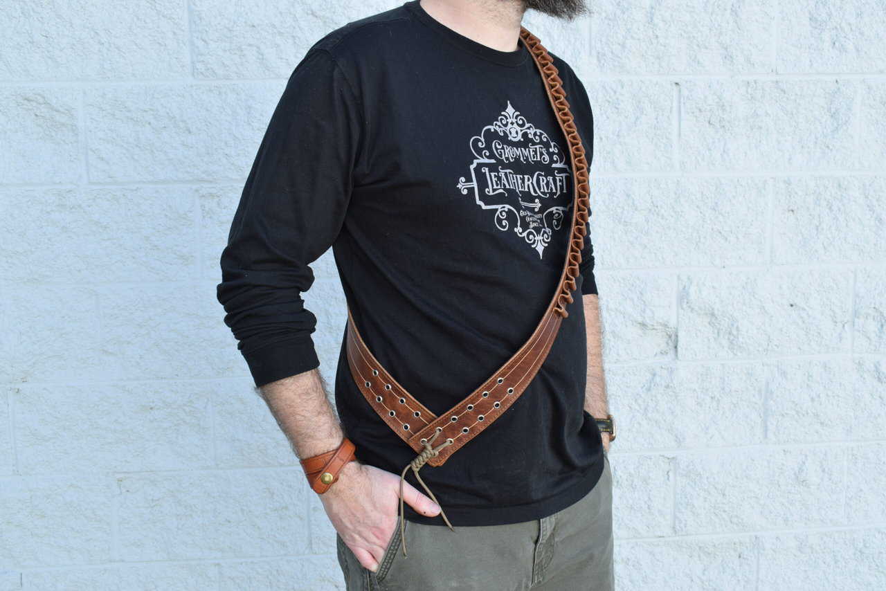 Each bandolier is 60″ long and is closed on the bottom with leather ties making it slightly adjustable. If you’d like yours made shorter or longer, feel free to message me to set up a custom order.