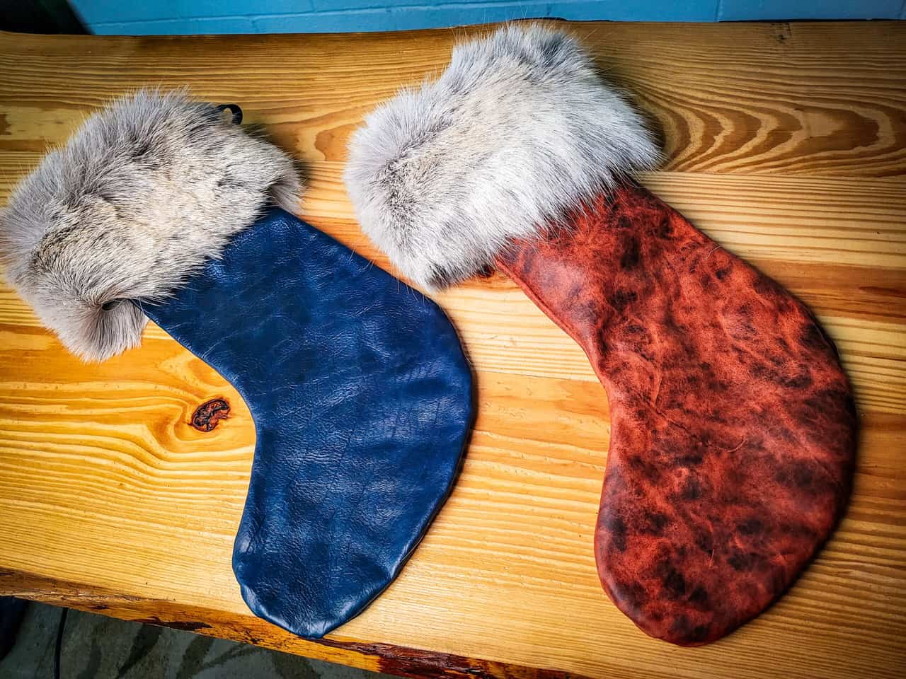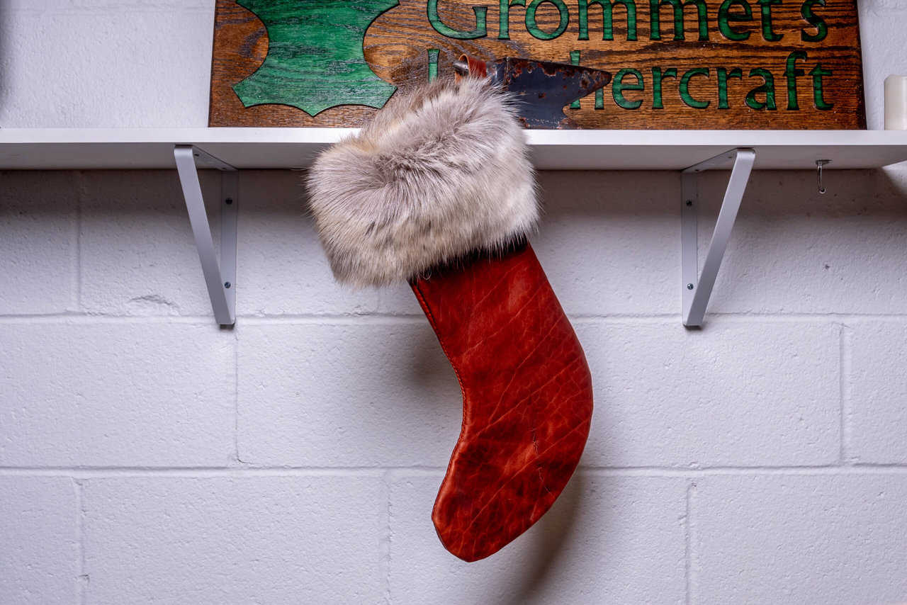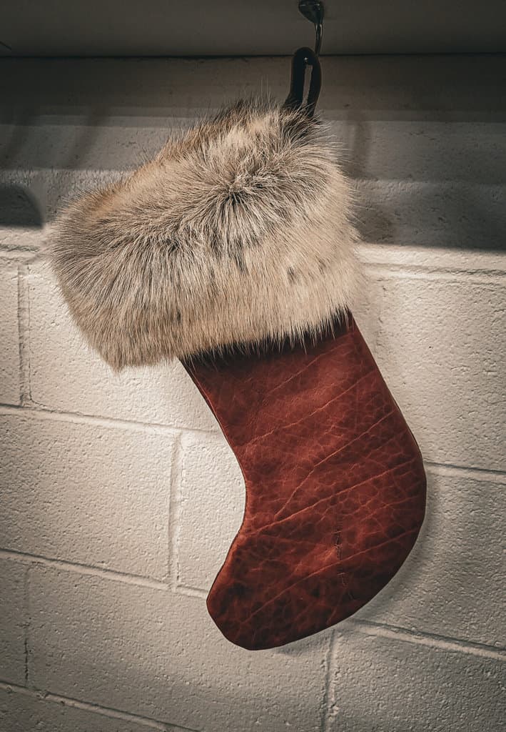 This is a handmade leather Christmas stocking made out of 3-4 oz bison leather with a reindeer fur cuff.