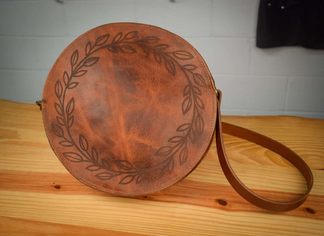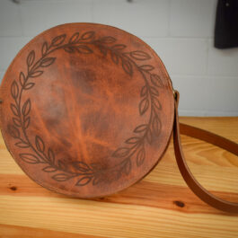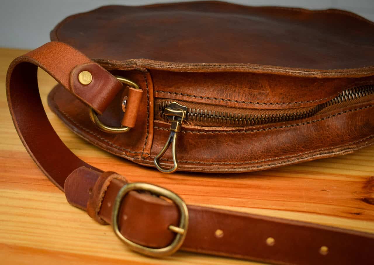 A handmade bison leather satchel with 2 round sides and a convenient crossbody strap.
