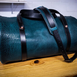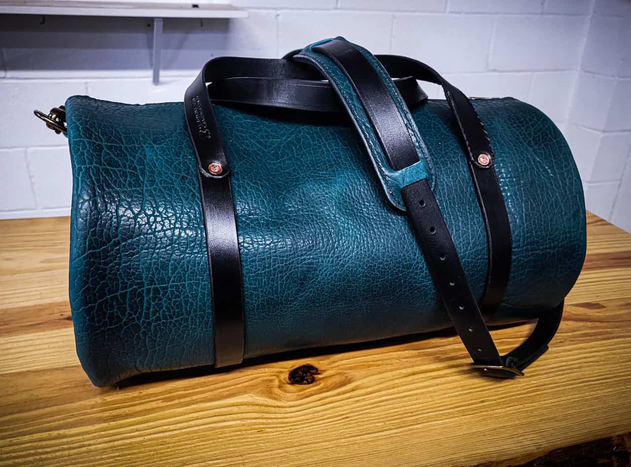 This is a handmade bison leather duffel bag.