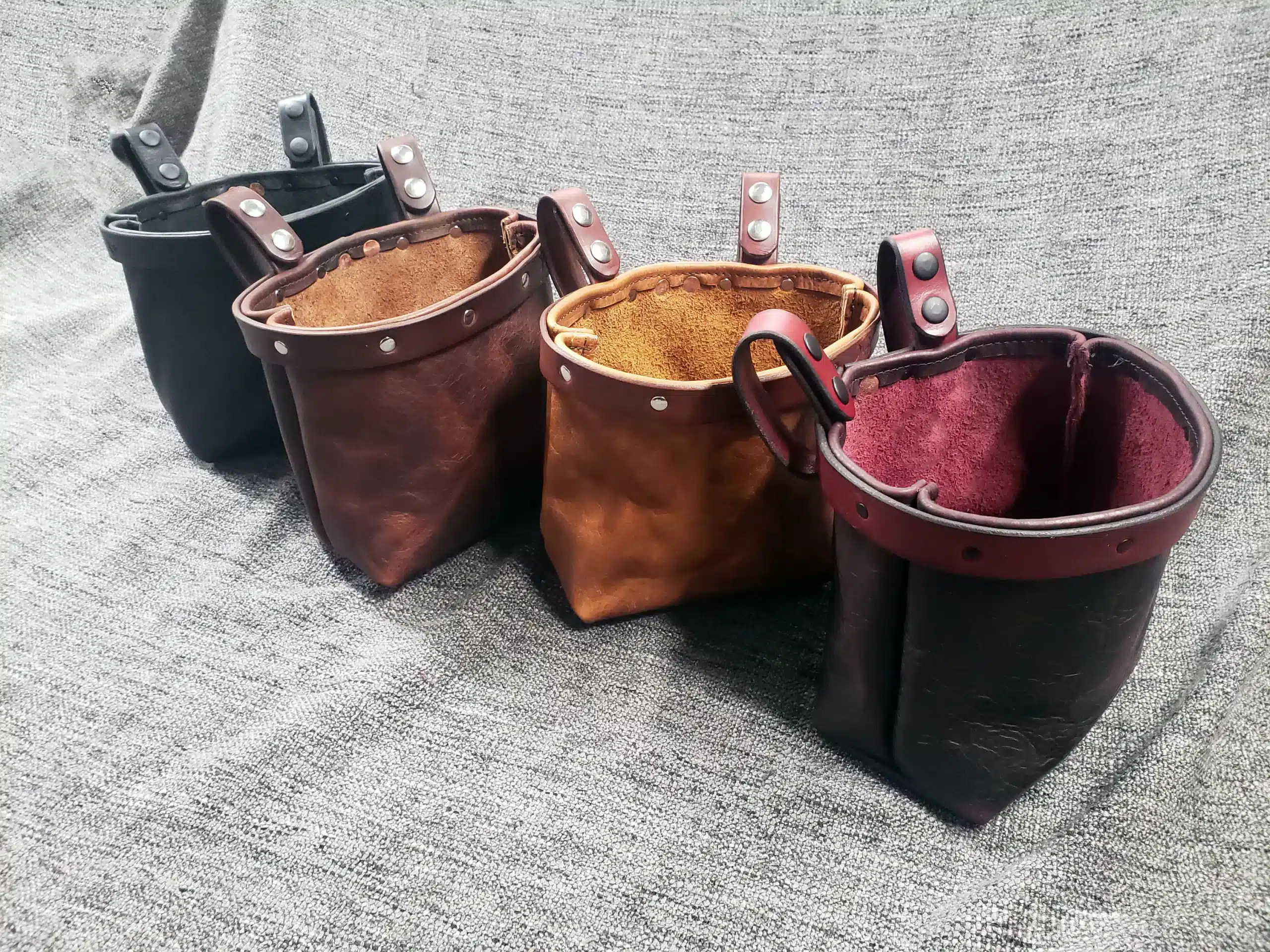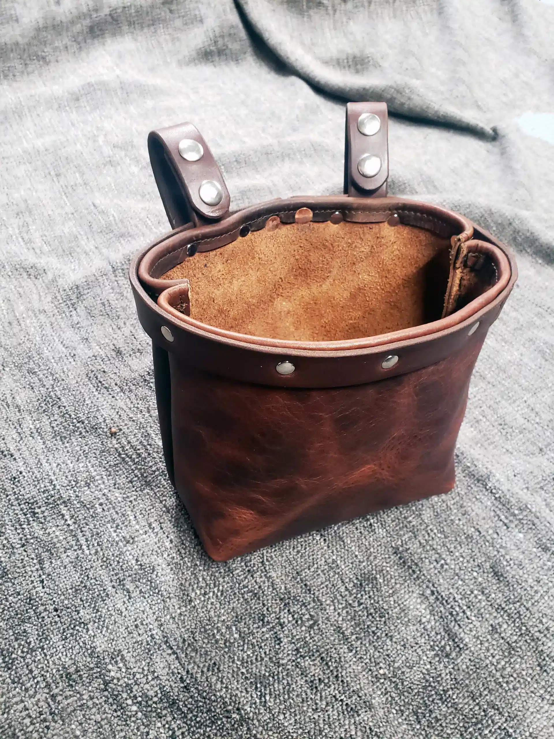 Each bag is made out of 5-6 ounce bison leather, with an 8-10 ounce latigo leather strap around the opening to help it stay open. It comes with 2 removable double snap closure belt loops, also made out of 8-10 ounce latigo.