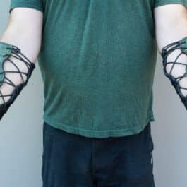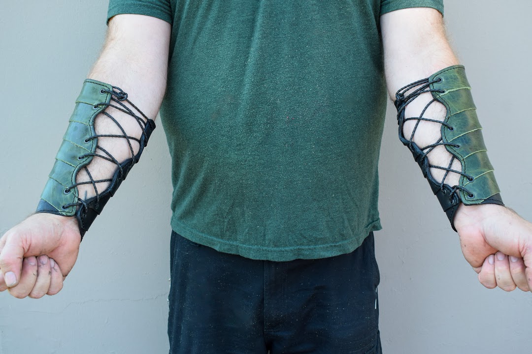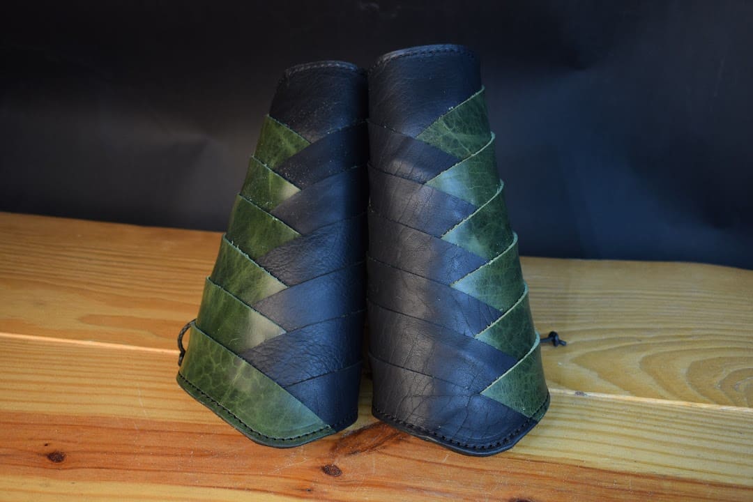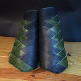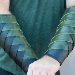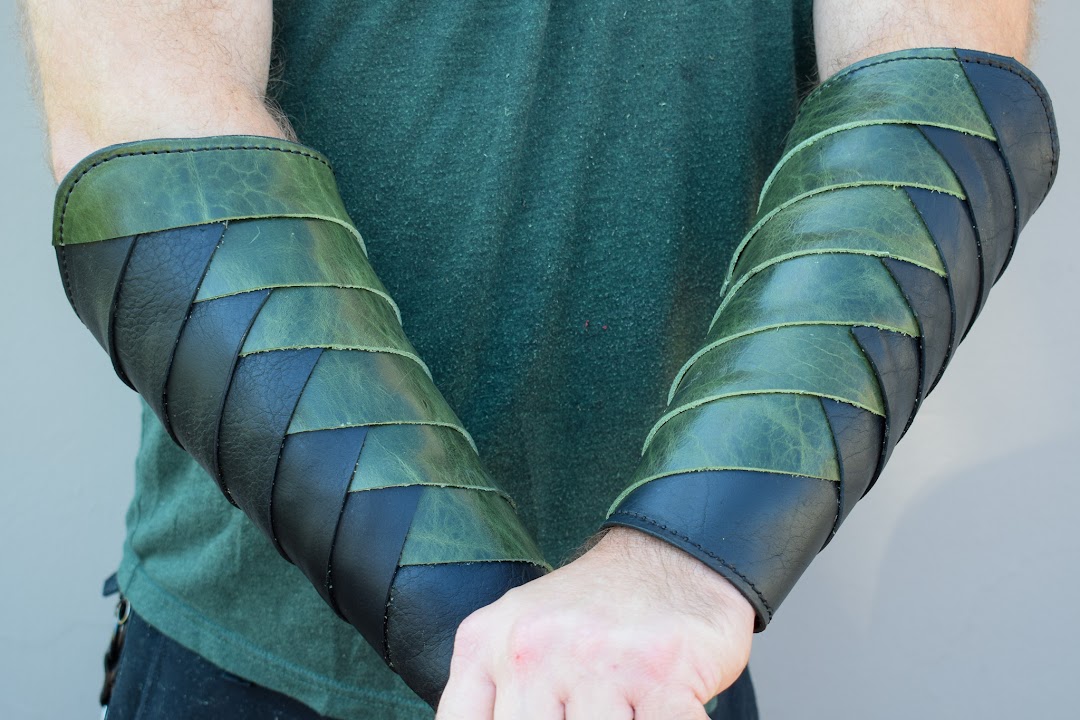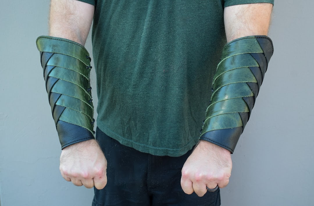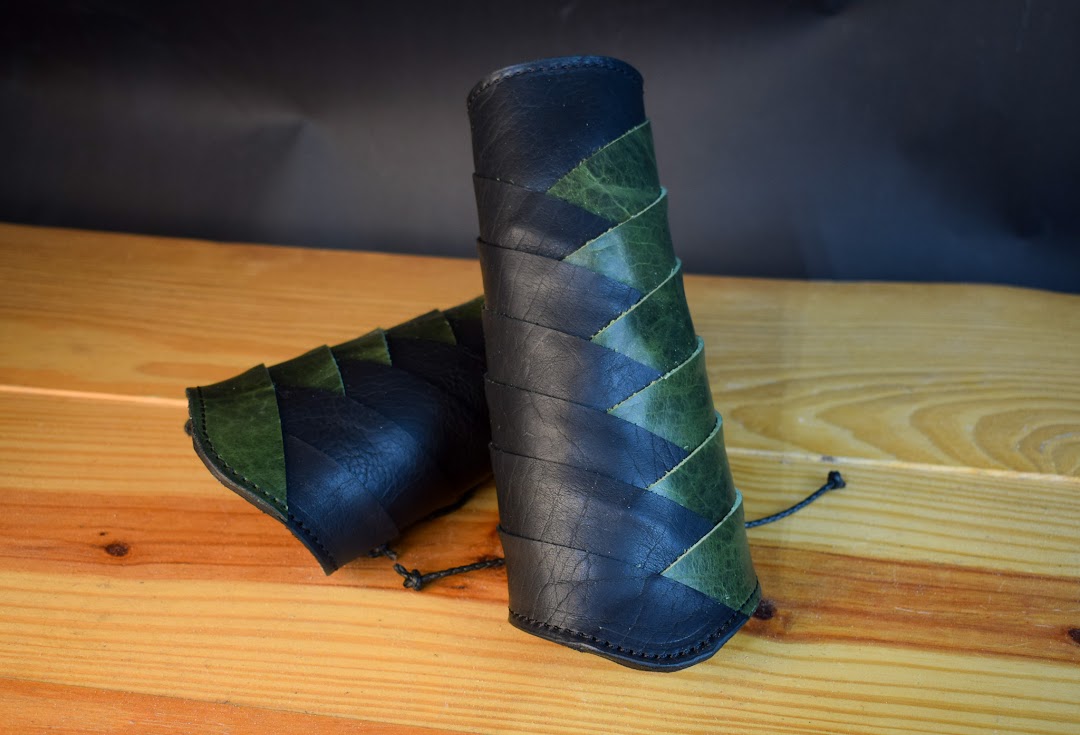 These are a pair of leather vambraces made out of woven strips of bison leather.