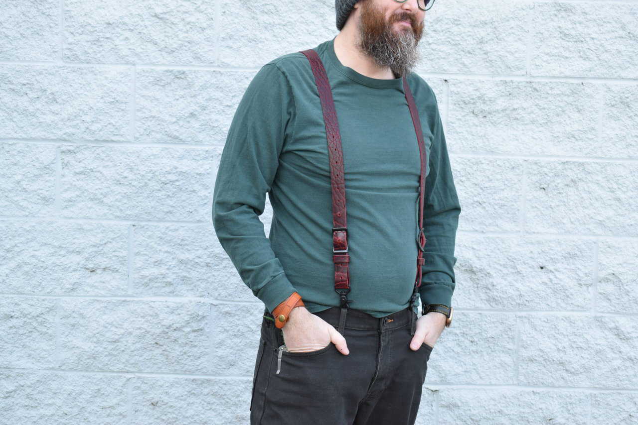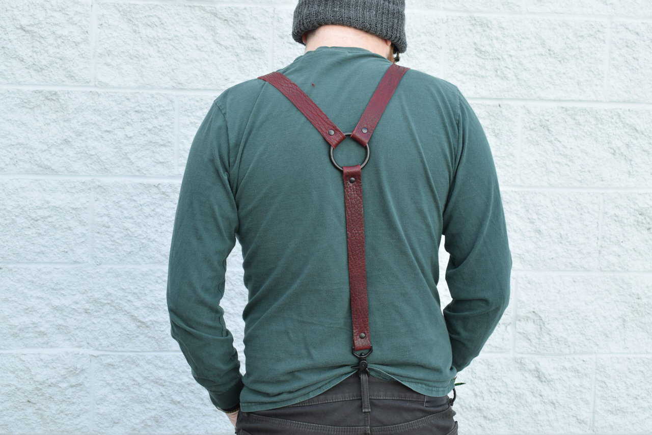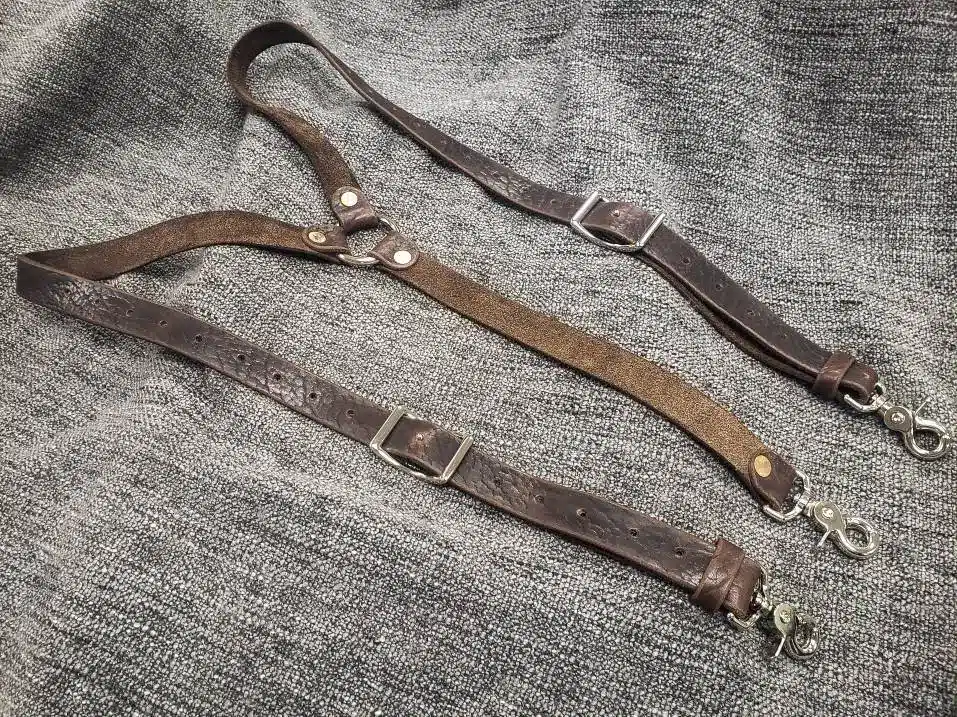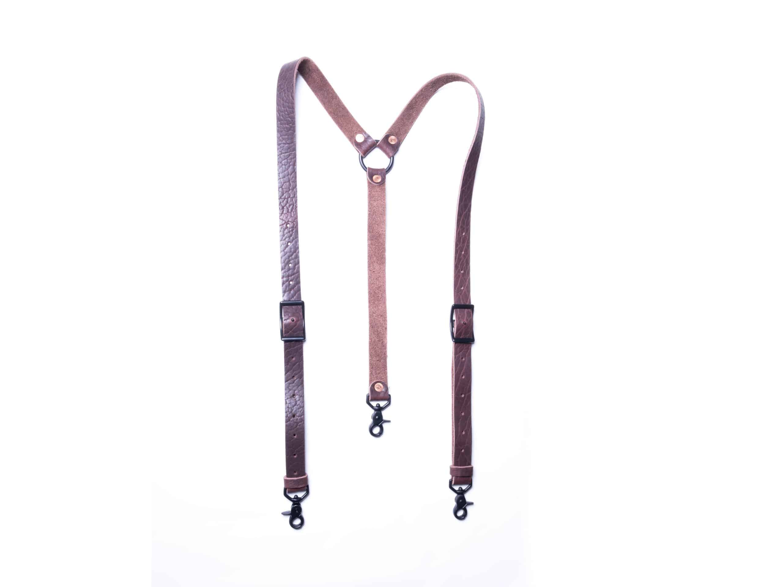 These are a set of leather suspenders. They are the same design and use the same hardware as our lumberjack suspenders, but are made out of a heavy weight bison leather. The bison leather is very tough, but has more flex than the latigo we use on our other suspenders which makes these very comfortable to wear.