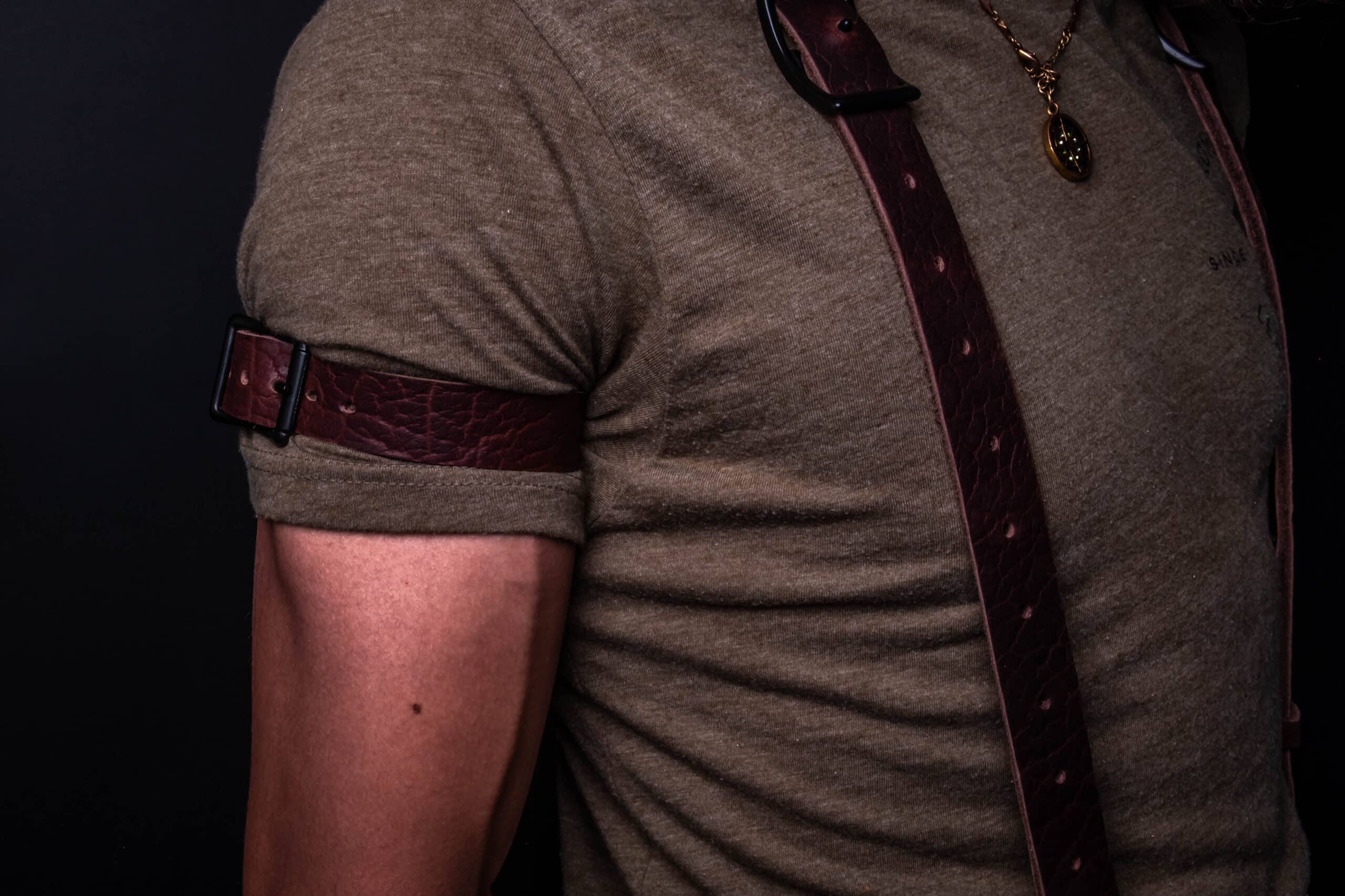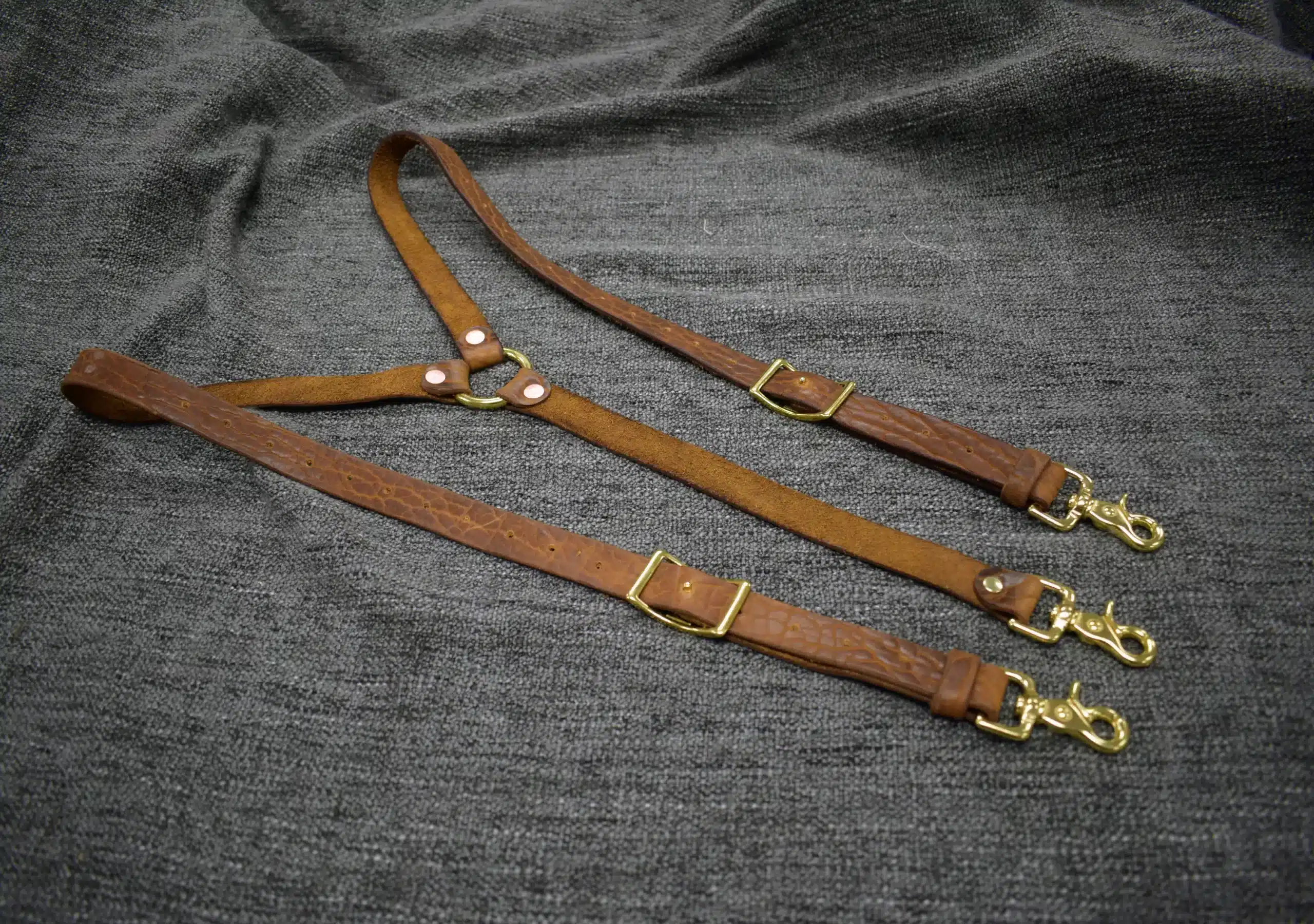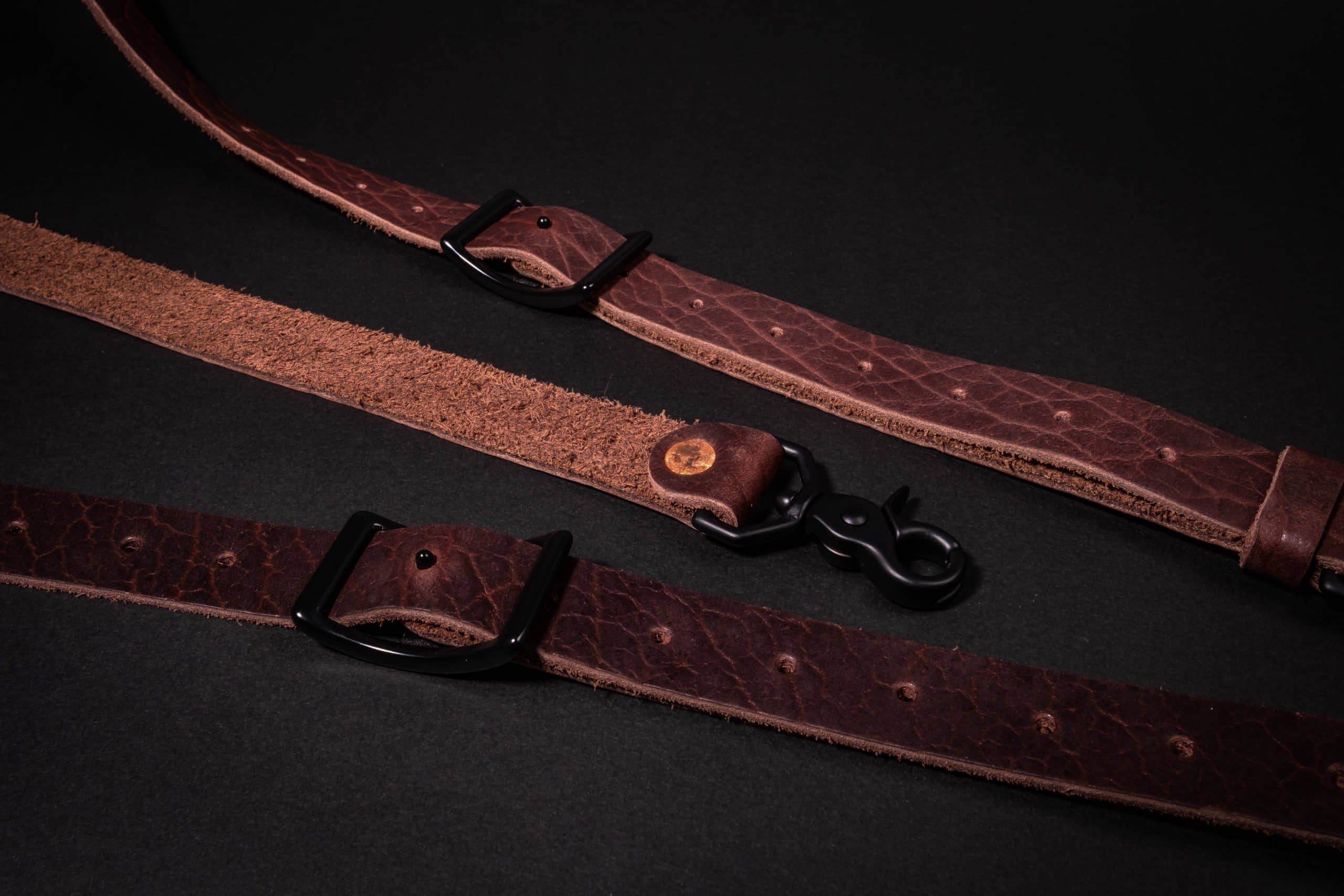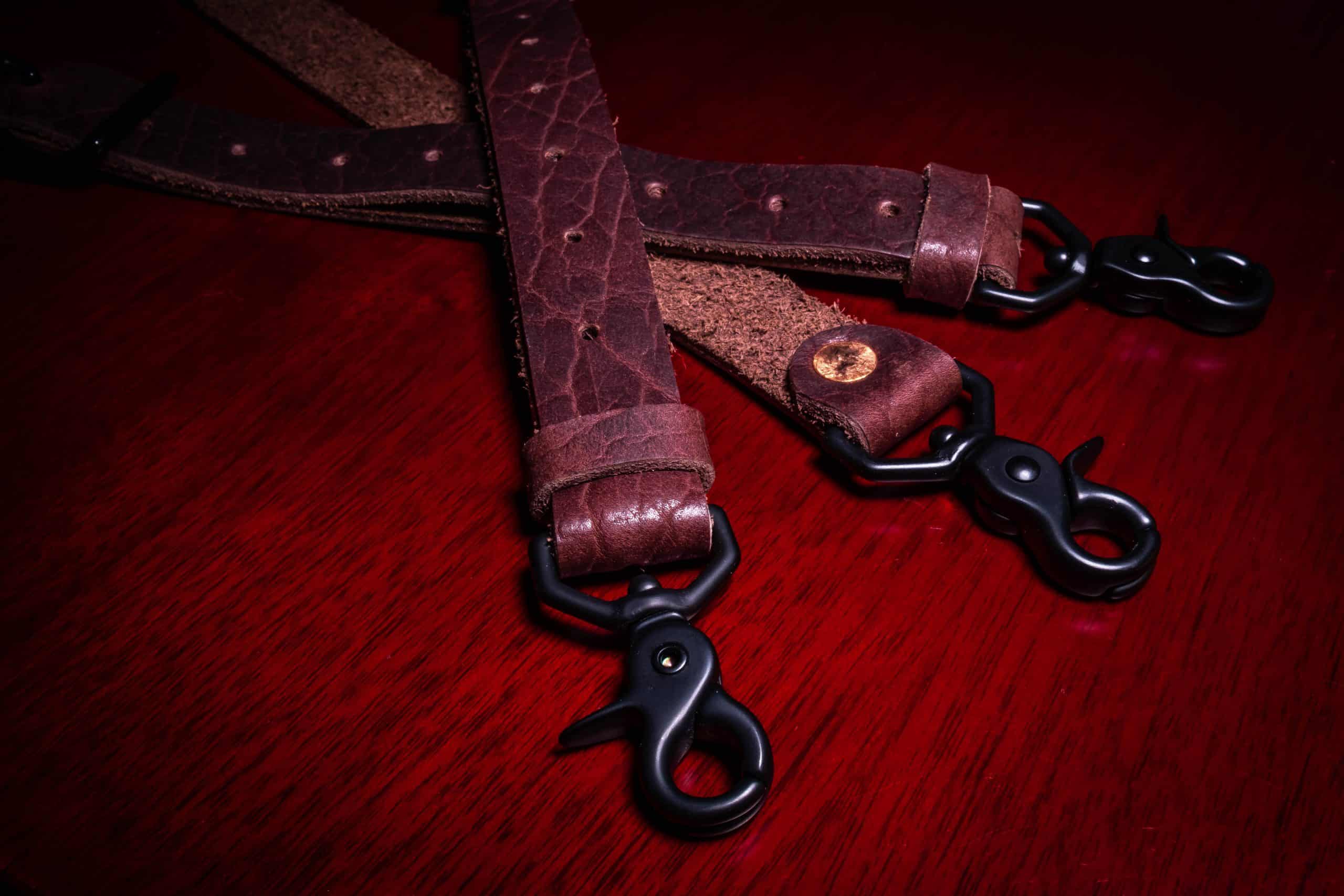 Each set is made of 1″ wide 6-7 ounce Bison leather which connect to a solid steel ring in the back and are adjustable via solid brass or steel conway buckles on each strap. The straps are riveted to the hardware with cold peened copper rivets.
