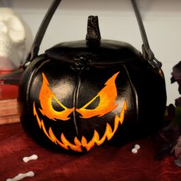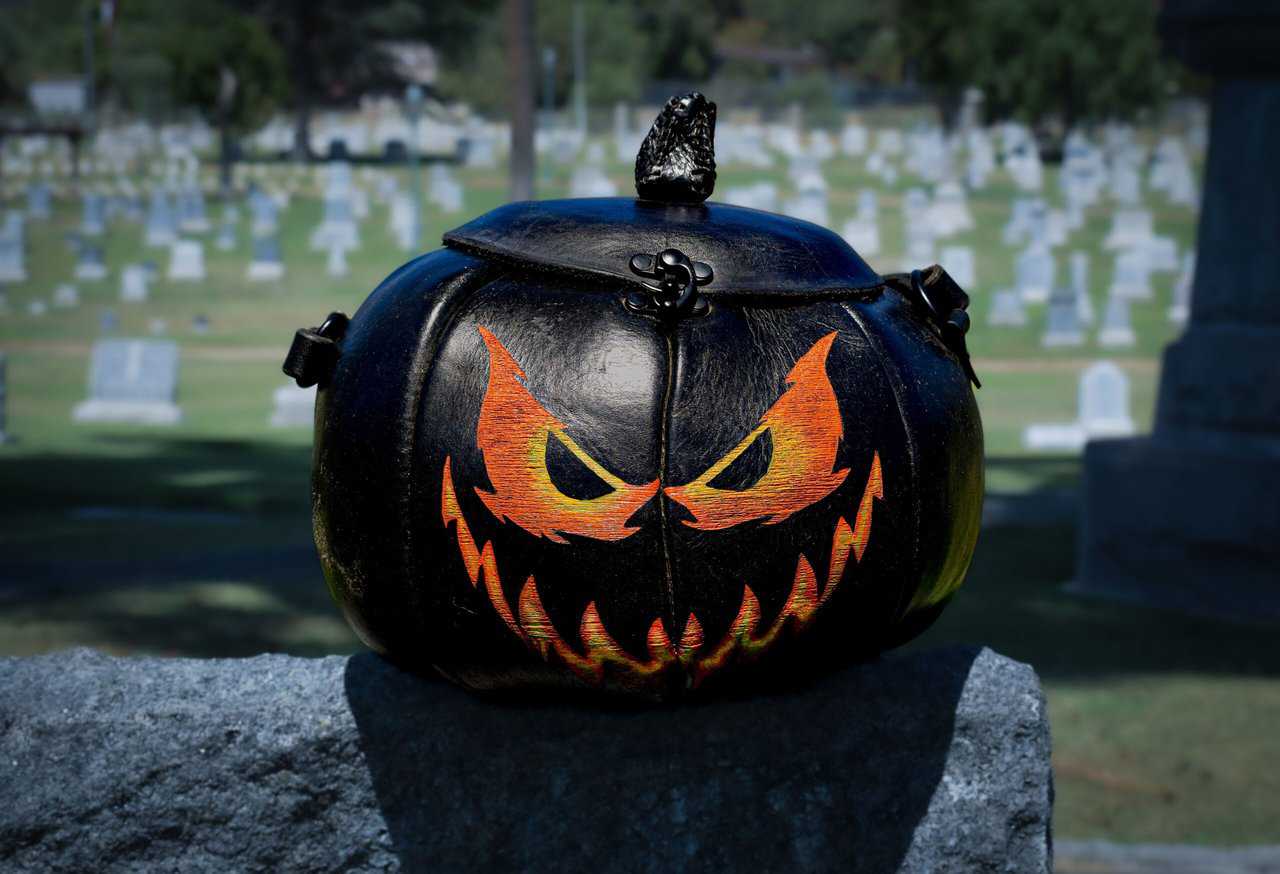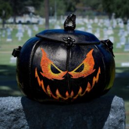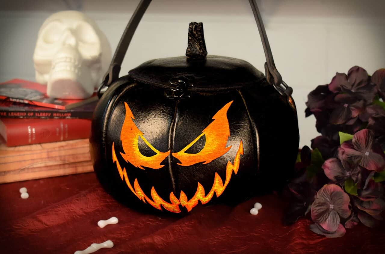The bag is black, with black hardware and black straps. It features a special engraved face that has been hand painted in yellow/orange.