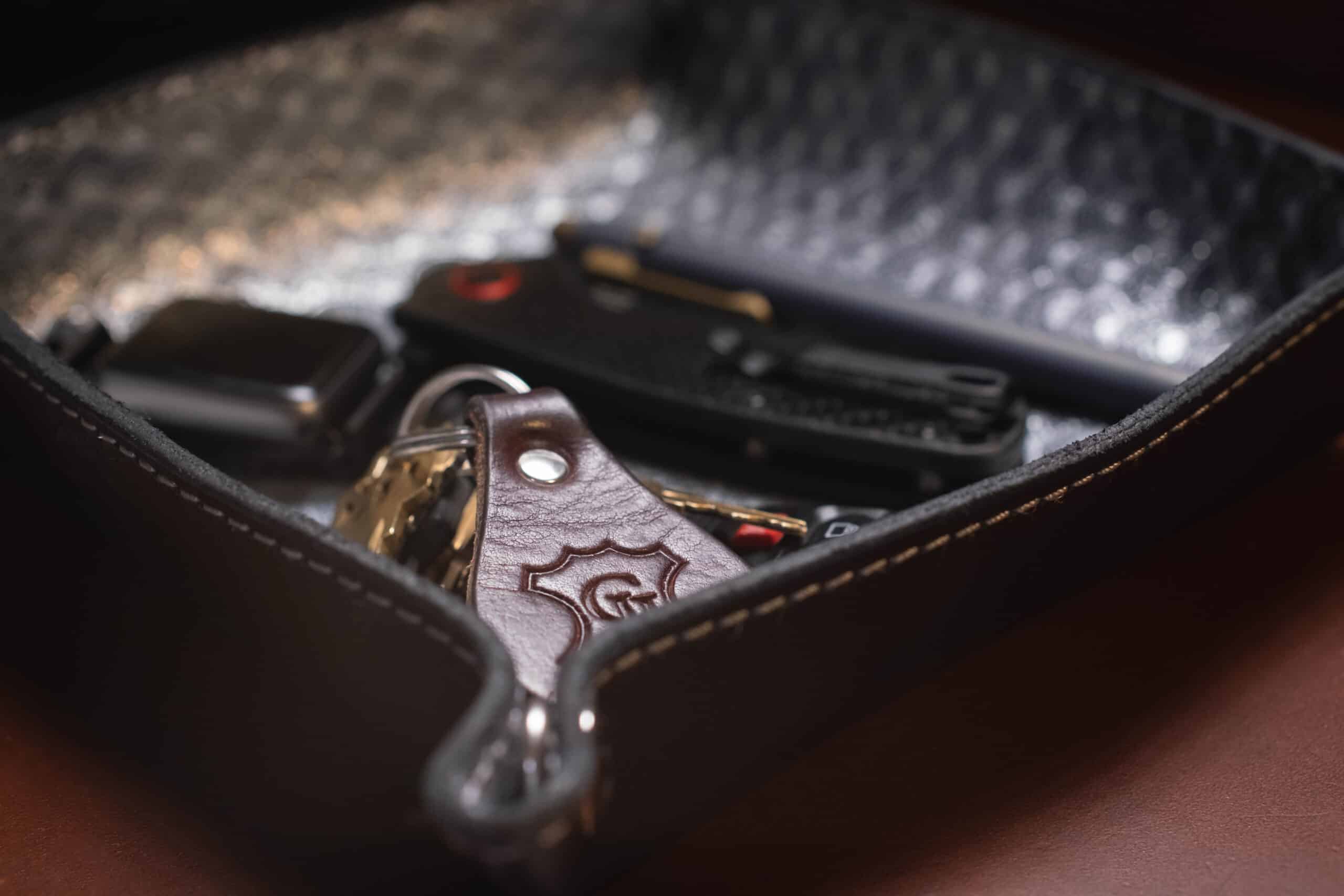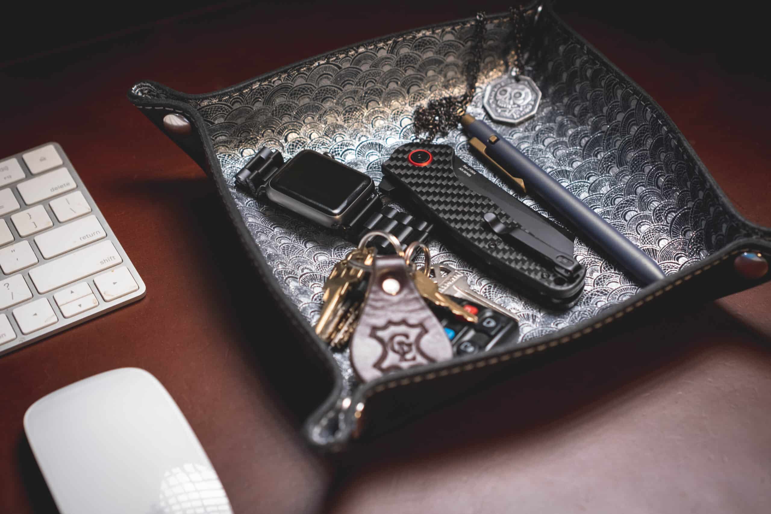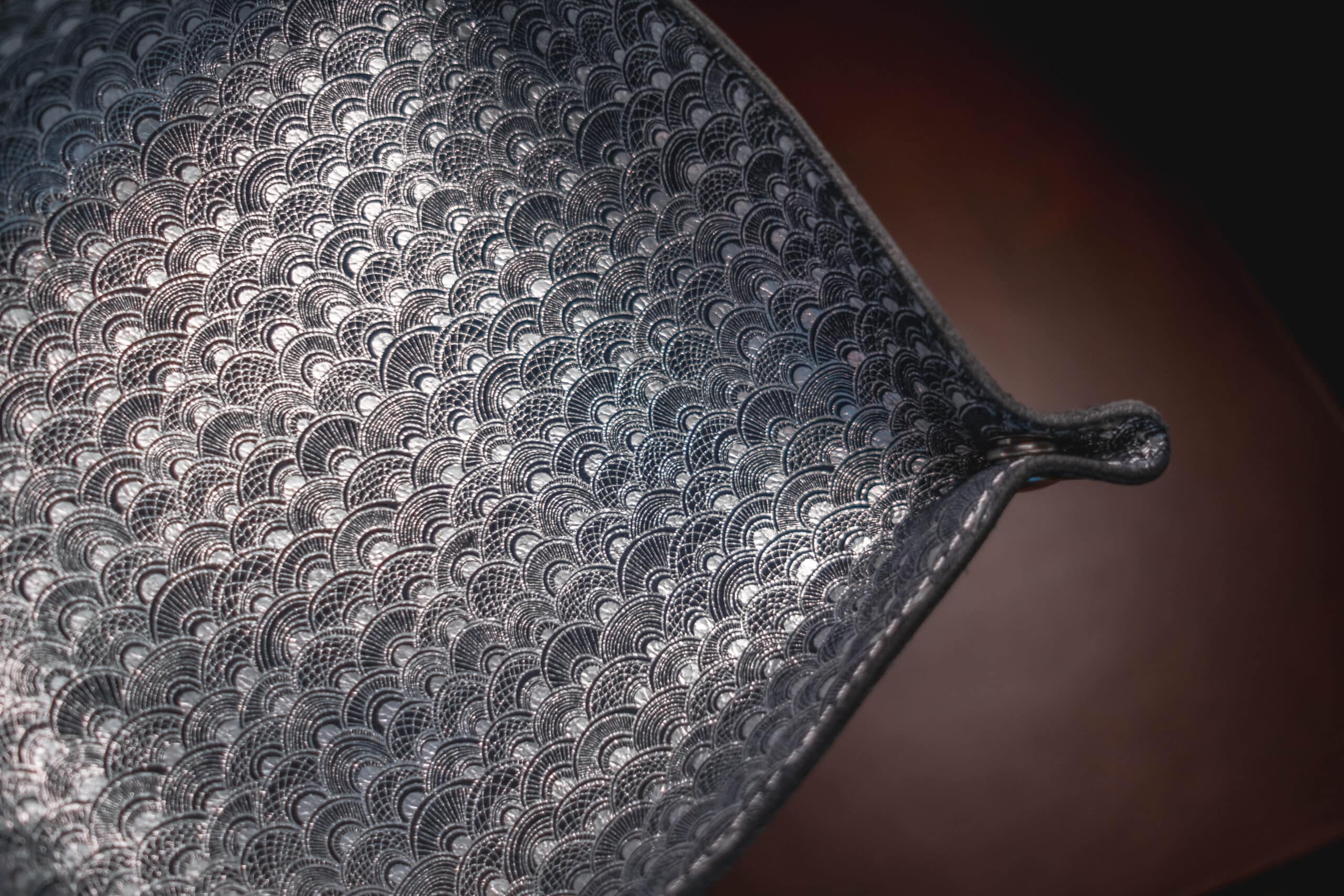 This is a one of a kind leather valet tray made out of dark blue napa leather and lined with lightweight suede that has a silver and blue metallic koi scale pattern. The sides of the tray snap together with silver snaps. We only acquired a small batch of this suede, so it is very unlikely that one like this will be made again.