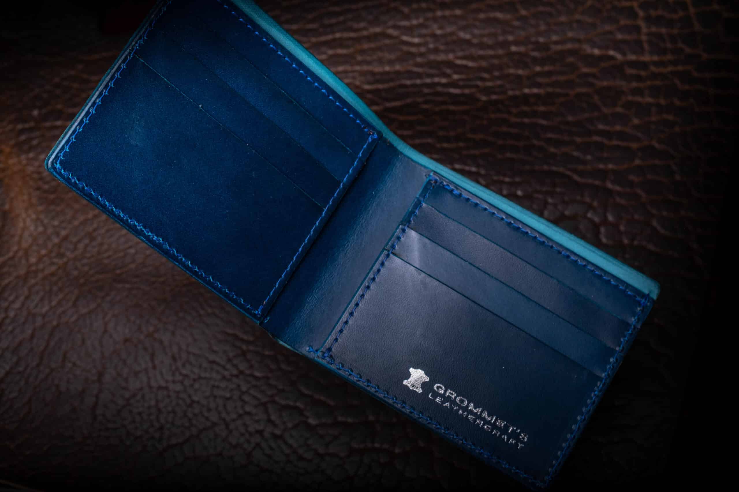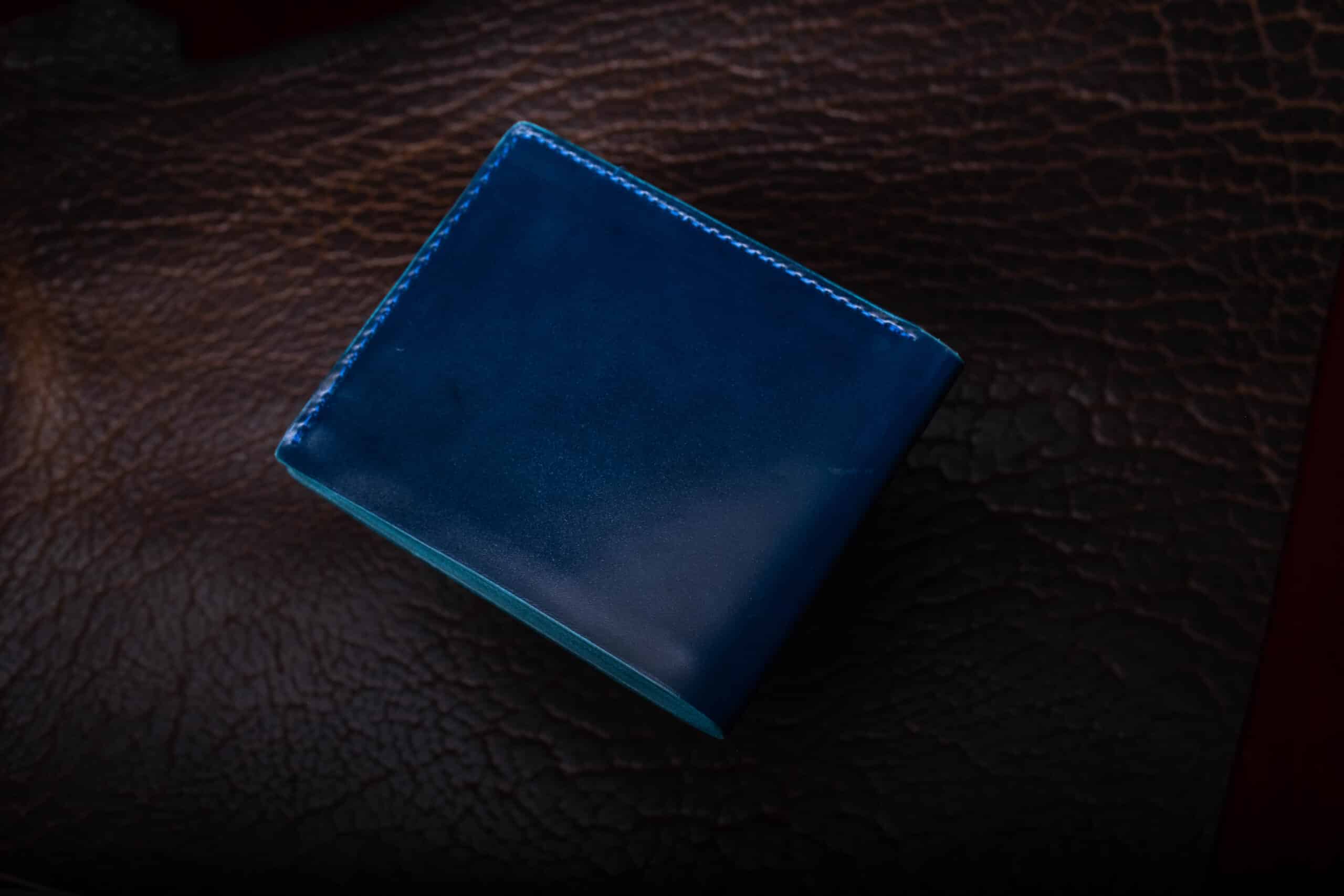 This is a special bifold wallet, with the outer layer made of Deep Blue shell cordovan leather from the Shinki Hikaku tannery in Japan.