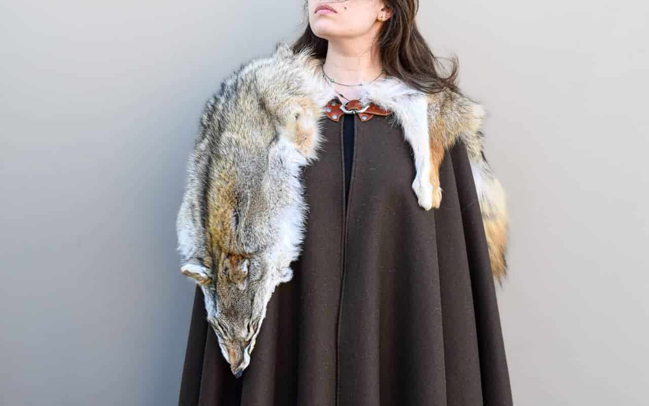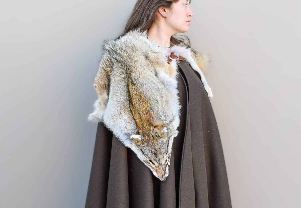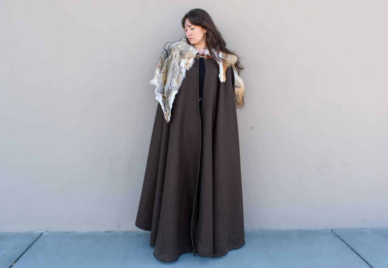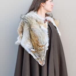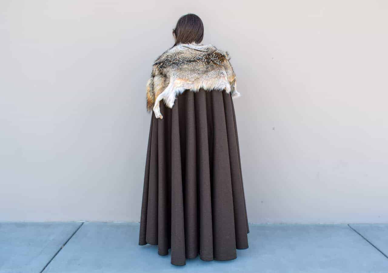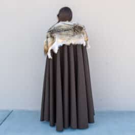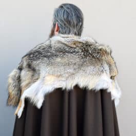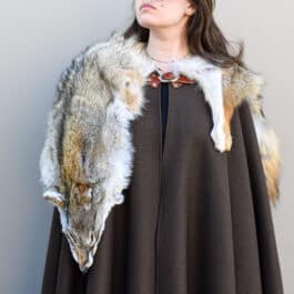 This cloak is a full circle of dark brown melton wool, with a full coyote pelt hand sewn around the collar for added warmth and for a stunning look.
