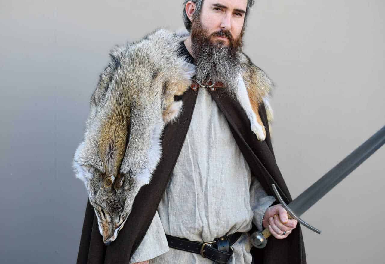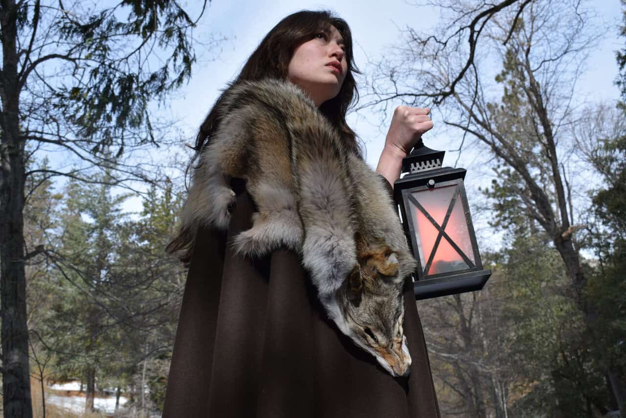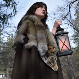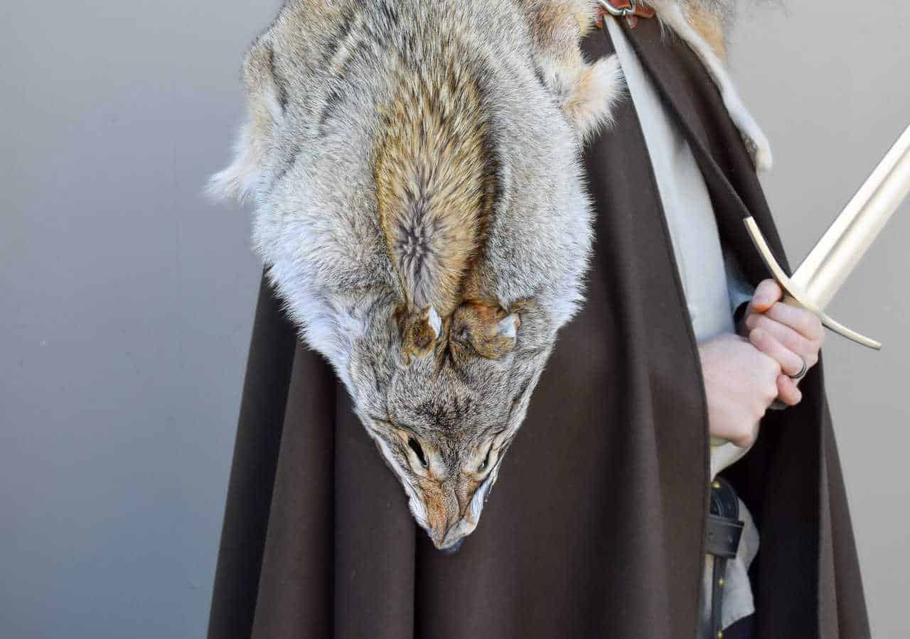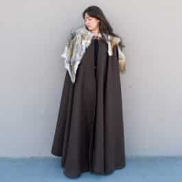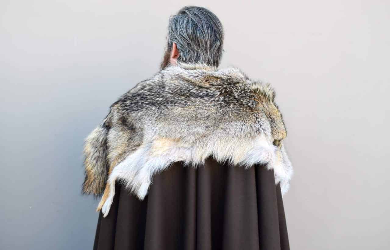 This cloak is a full circle of dark brown melton wool, with a full coyote pelt hand sewn around the collar for added warmth and for a stunning look.