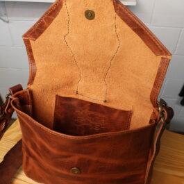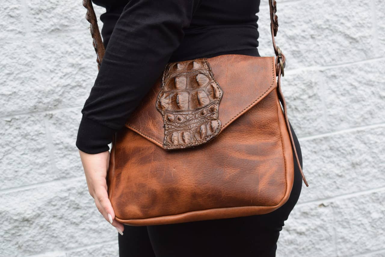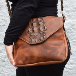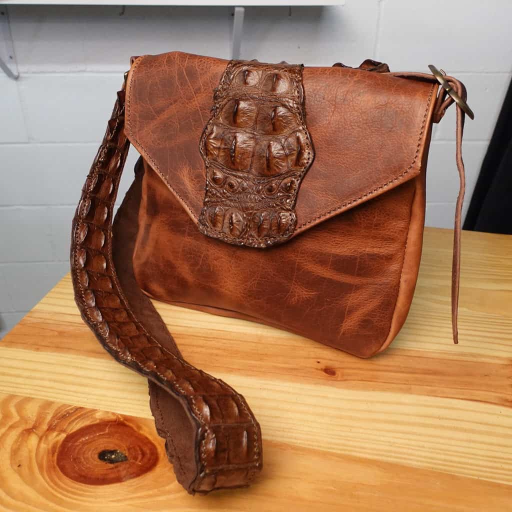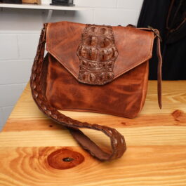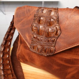 This is a one of a kind bag, based on one of our bison satchels, accented by a unique crocodile back “medallion” on the flap, and overlain on the suede-backed shoulder strap.