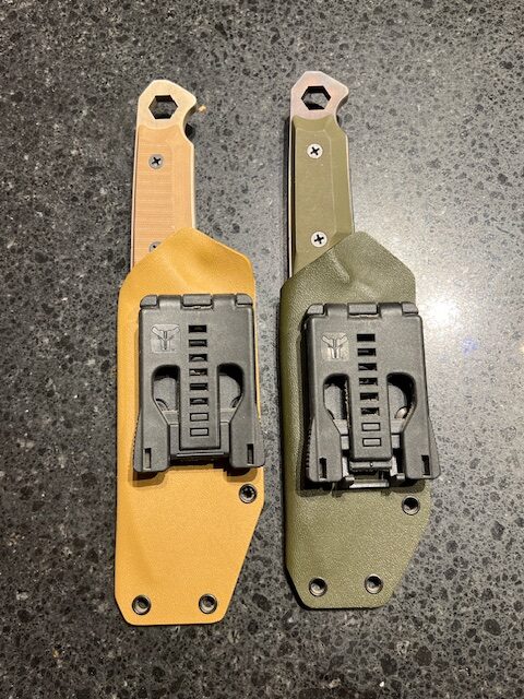 Black kydex sheath with tek lock for a Medford STA fixed blade being sent in. Similar in shape to the stock sheath in the photo.