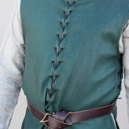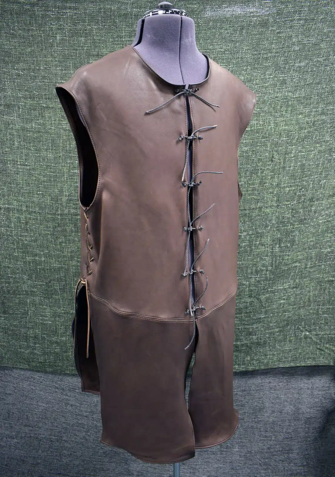 Each jerkin has a back seam along the waist line and an angled seam in front. All of the edges are hemmed, and the side lace closures are reinforced with a second layer of leather and metal eyelets.