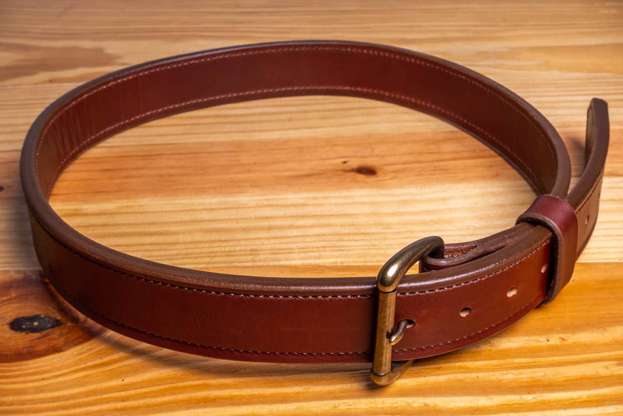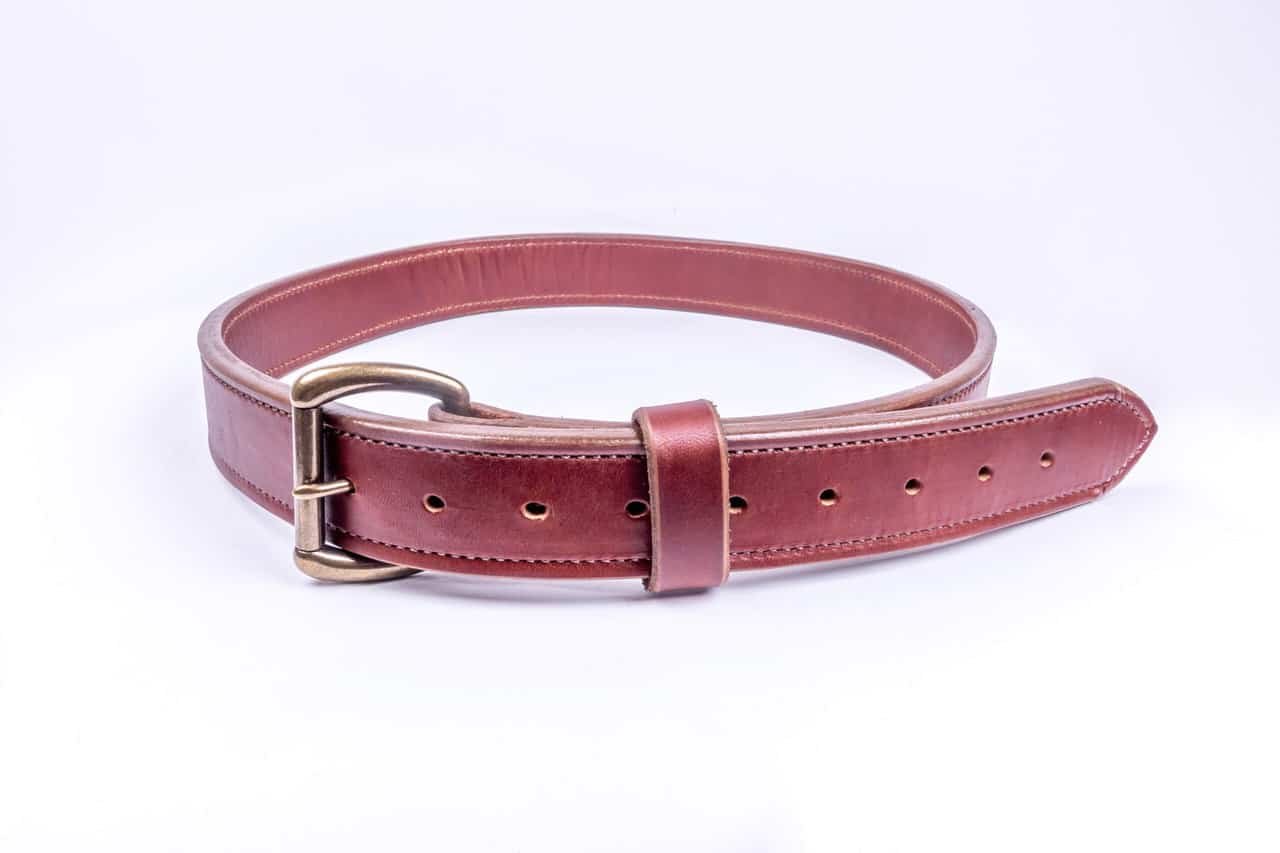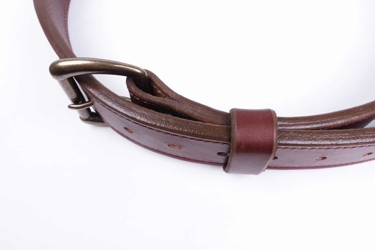 Each belt is 1.5″ wide and fully stitched along the edges. The belts are fitted with a solid brass roller buckle and leather keeper.