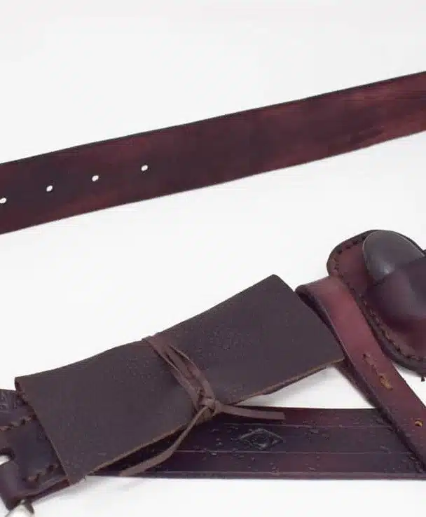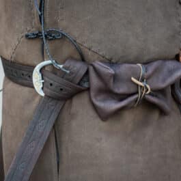 The belt can be made with or without the weathered/distressed finish, and can be made with the belt on its own, or include the tobacco pouch, whetstone pouch, and sword-straps.