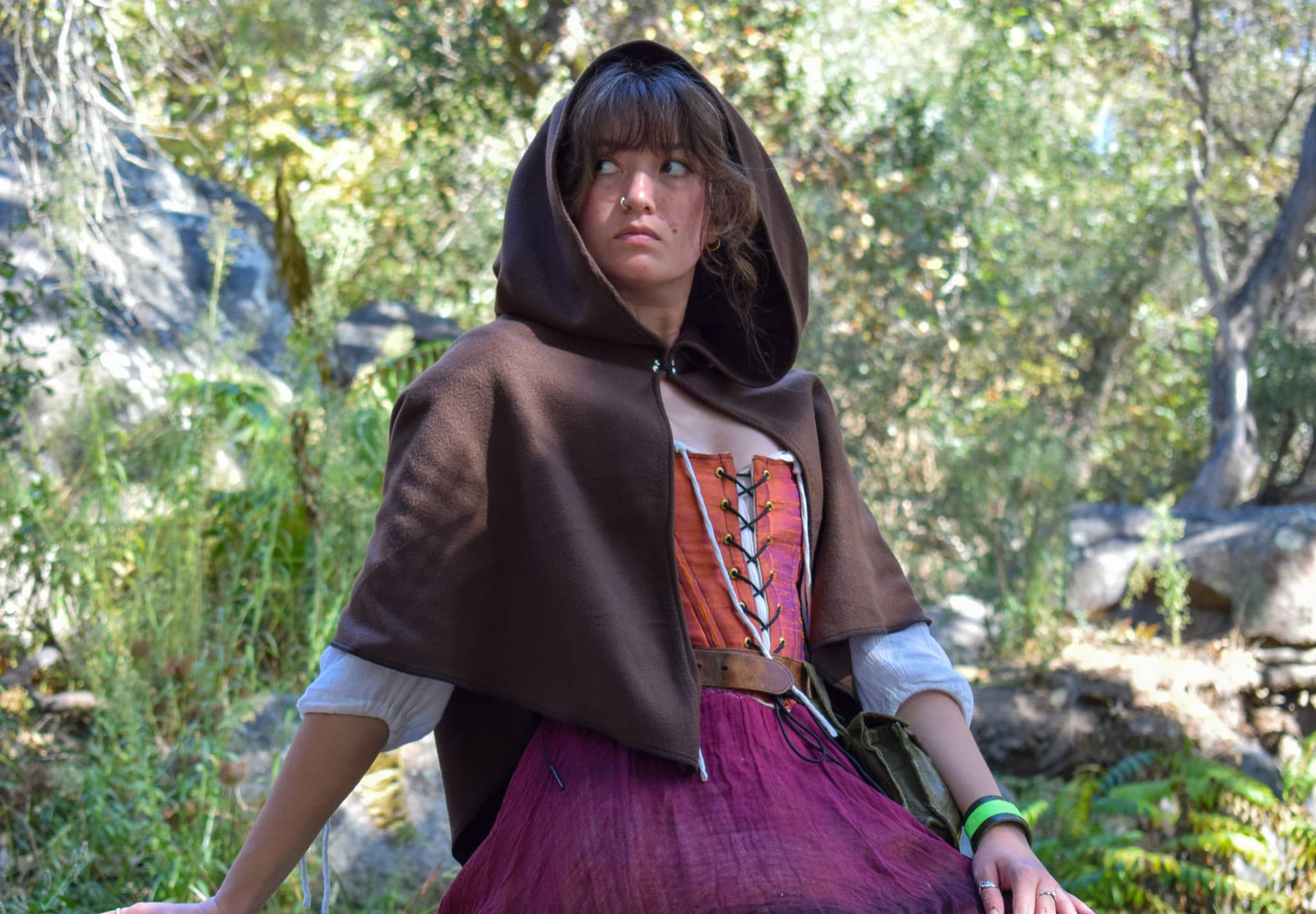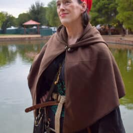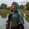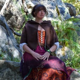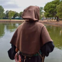This is a simple hooded cloak made out of a soft and comfortable poly blend fleece. Similar to our full length hooded cloak, but shorter on the sides, coming to point in the front and back, with an oversized hood.