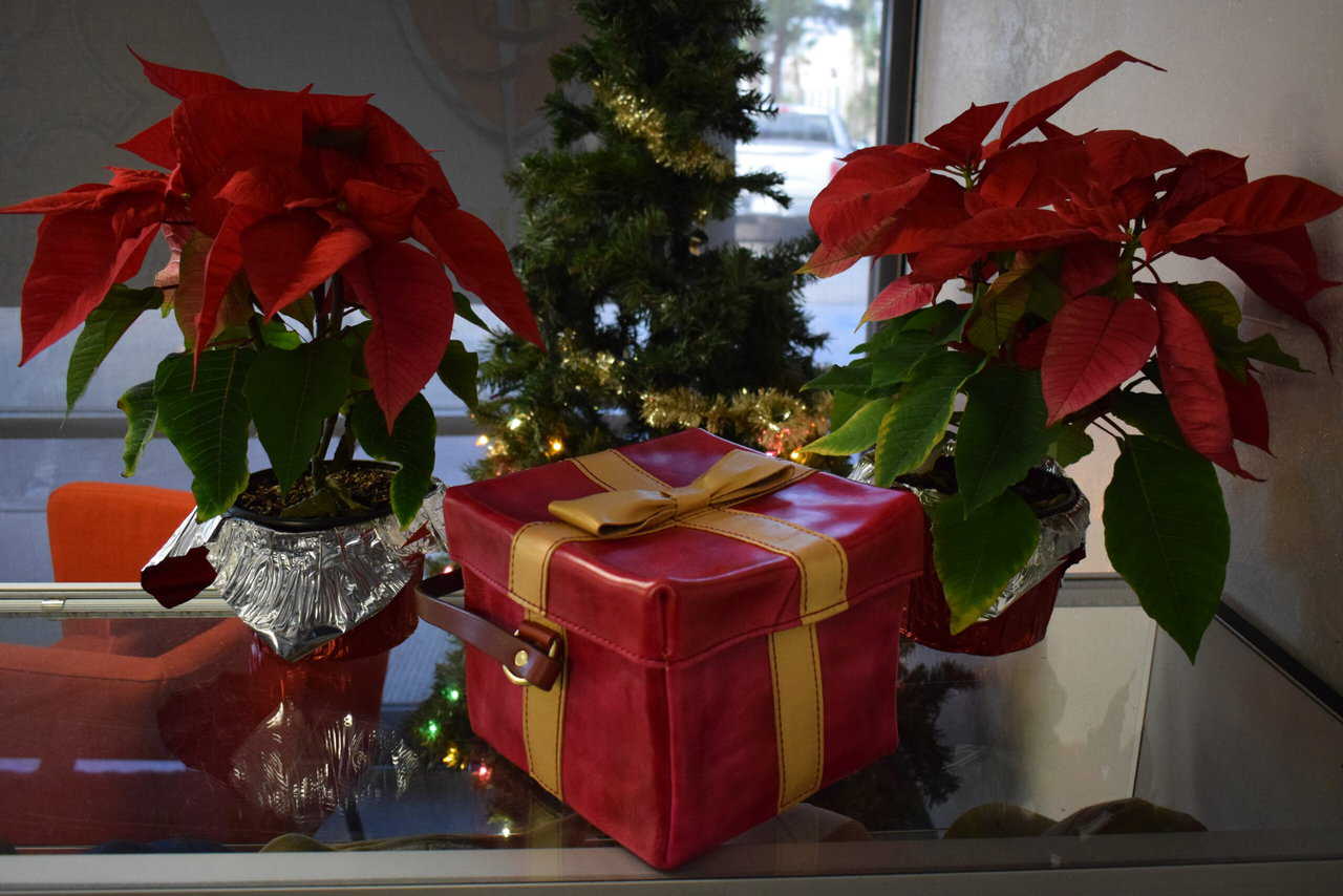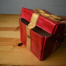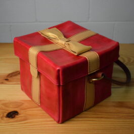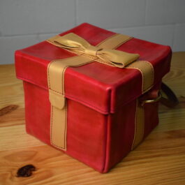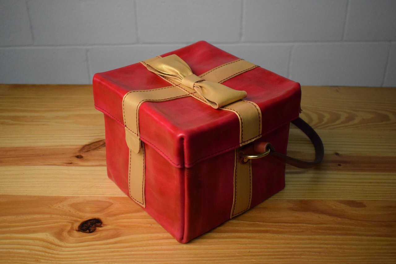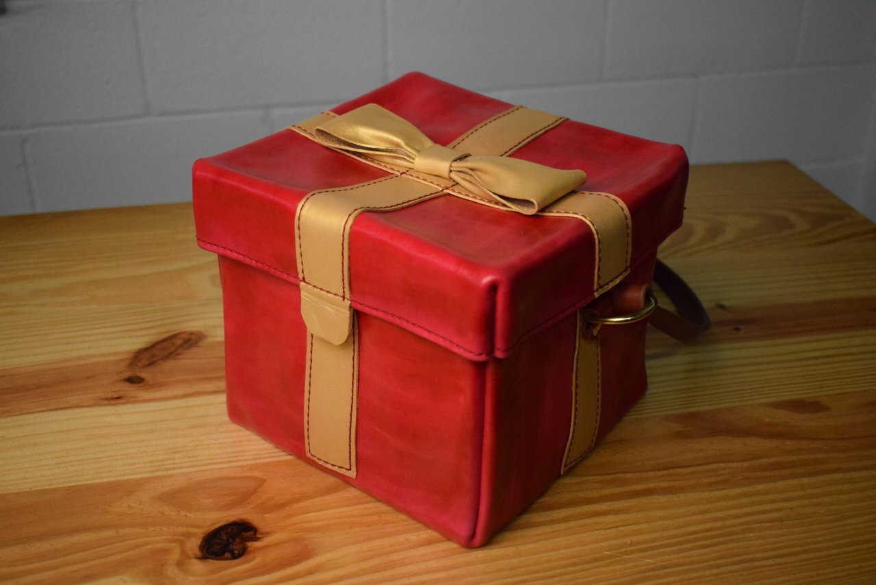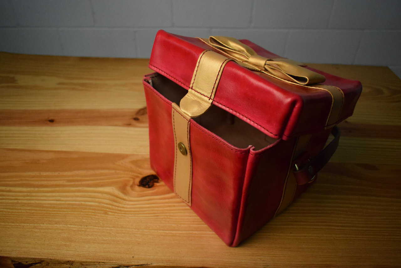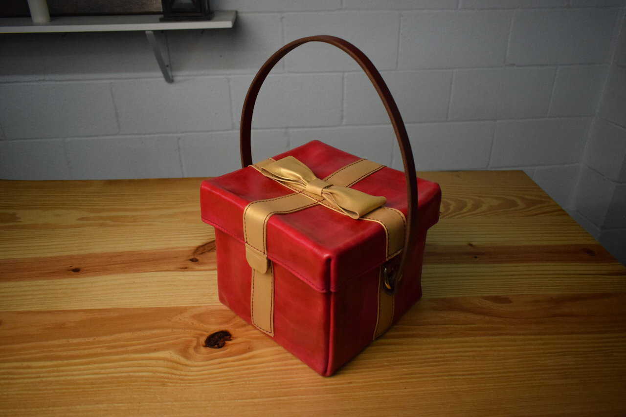 These are handmade leather bags, which are styled to resemble a holiday gift box.