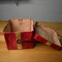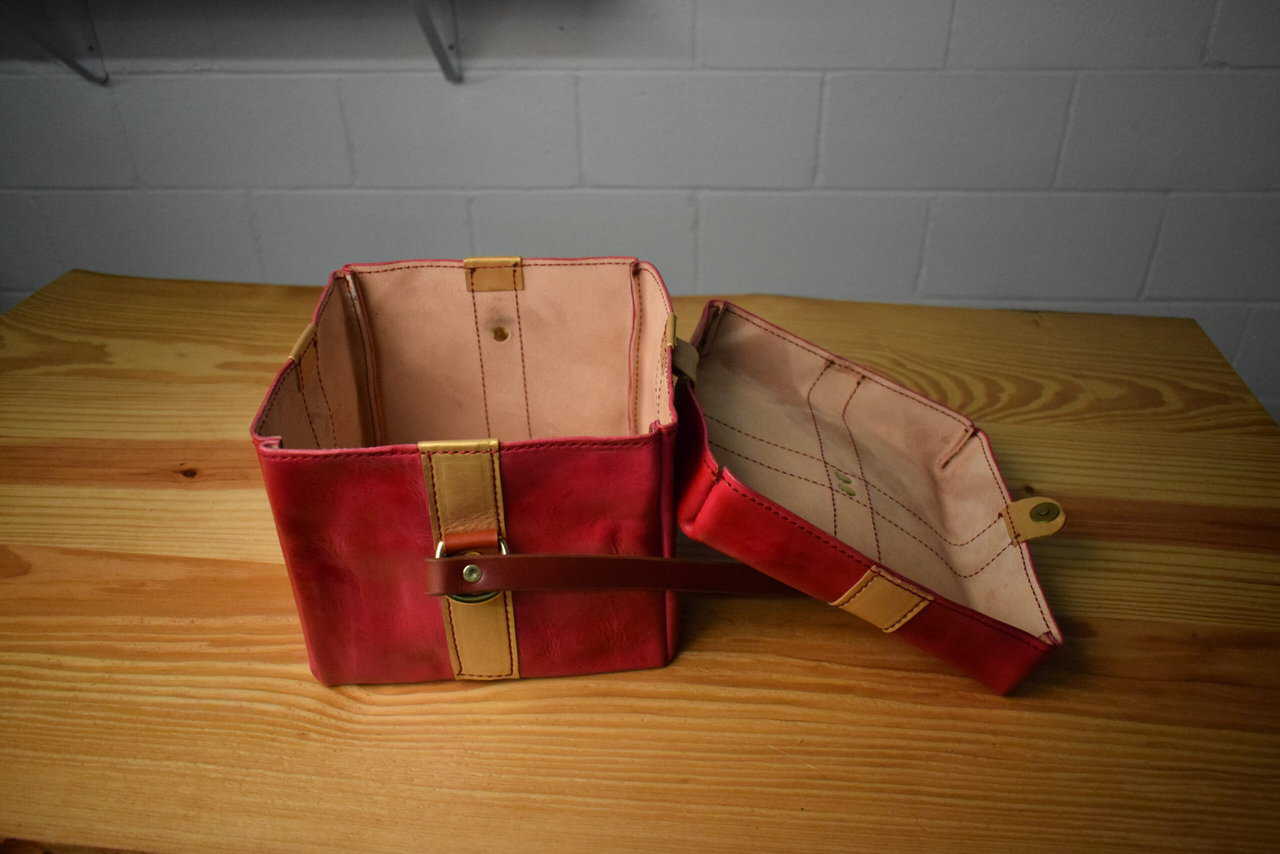 Each bag is made out of 5-6 ounce vegetable tanned cowhide and wet-formed and hand dyed to the color of your choice. You also have your choice of colors for the ribbon/bow and the stitching around the edge of the ribbon.