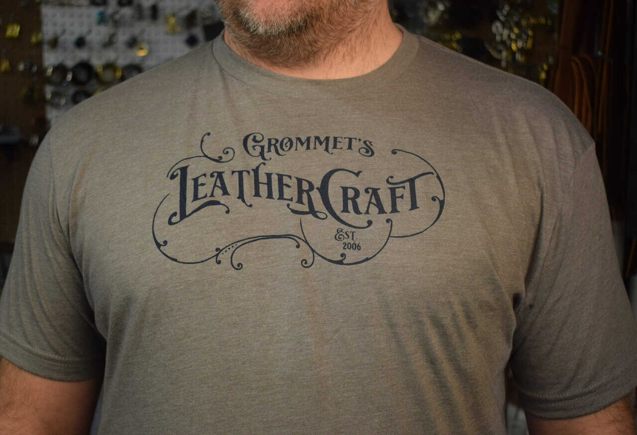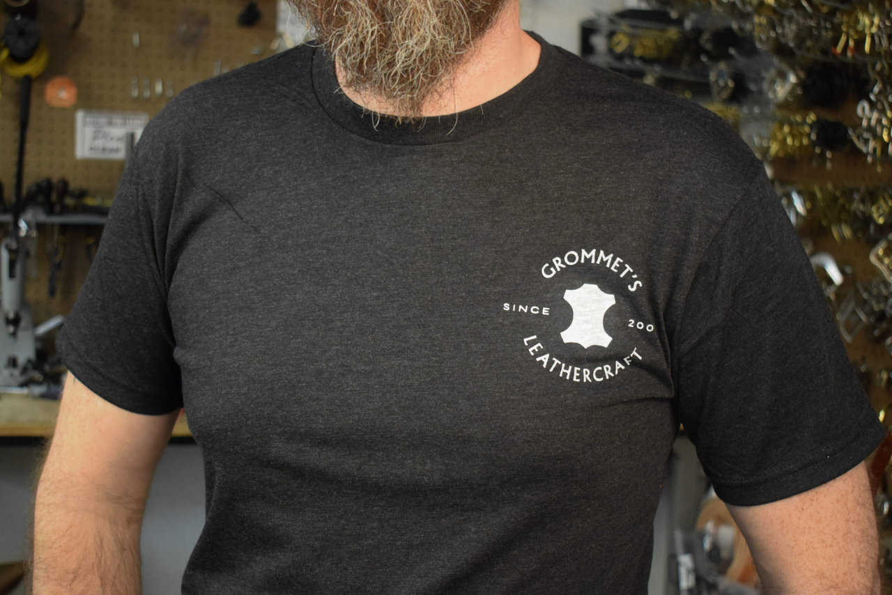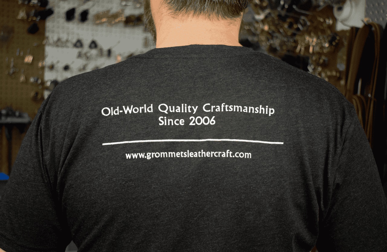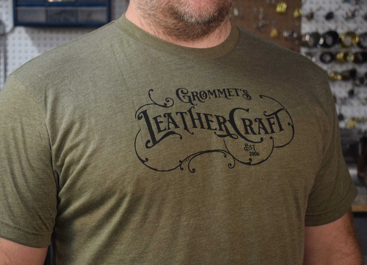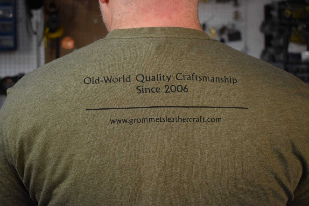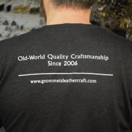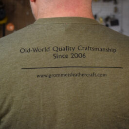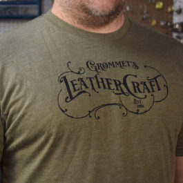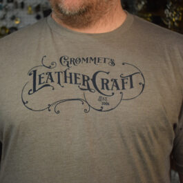 A handsome T shirt with your choice of Grommet’s Leathercraft logo on the front and heroic phrase on the back. (The “Old-World” Logo does not have anything on the back of the shirt, as the other 2 designs have the Old-World saying on the back, and having the same phrase on the shirt twice seemed redundant.)