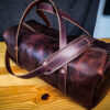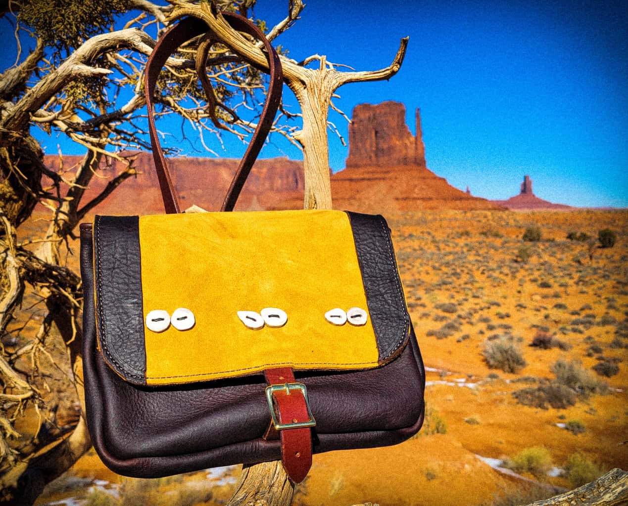 Each bag is made out of 4-5 ounce bison leather with a suede overlay on the flap with 6 elk antler buttons stitched as a decoration. The bag closes via a 1″ strap and buckle. Each bag features a 1″ wide 60″ long shoulder strap made out of 8-10 ounce latigo cowhide in your choice of color.