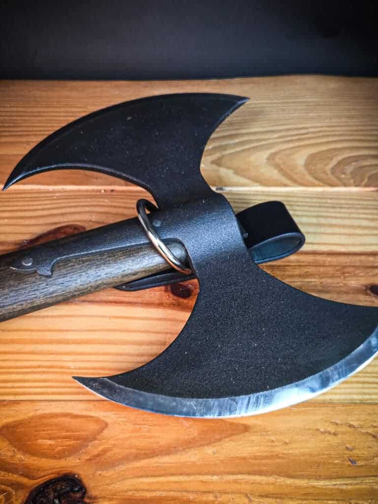 This is a handmade leather frog for hanging your axe, hatchet, hammer, or other shafted weapon/tool vertically from your belt