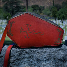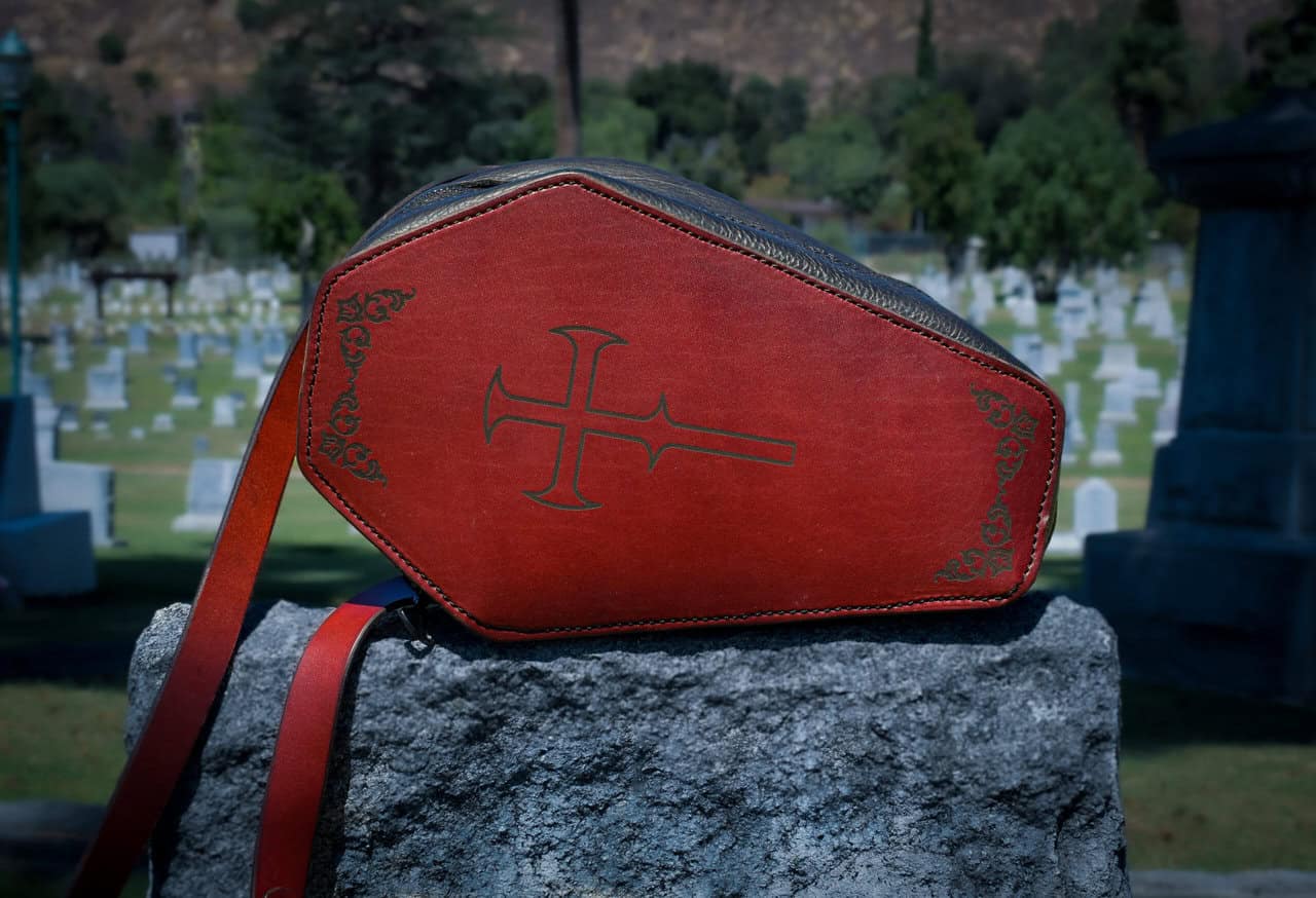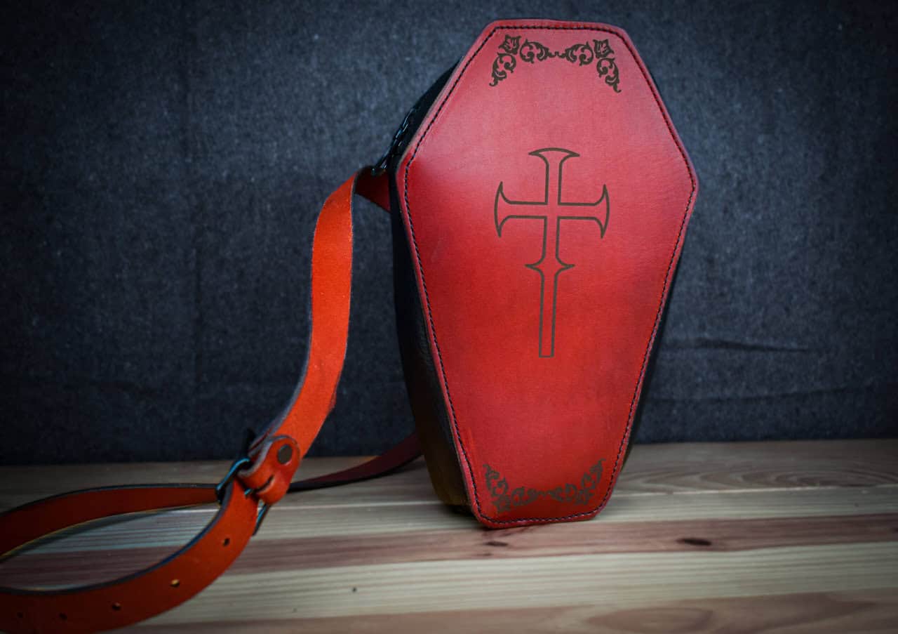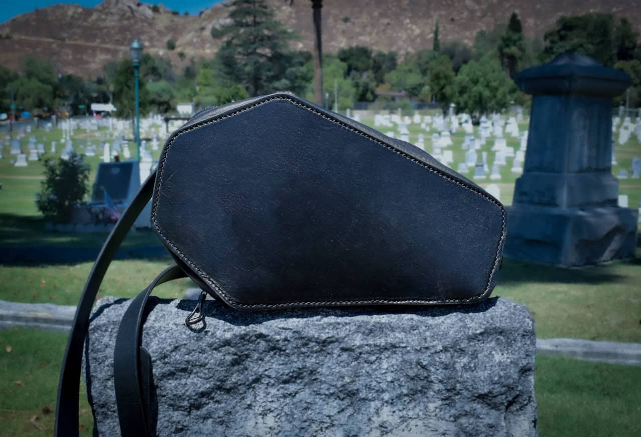 This is a handmade leather bag, shaped like a coffin with a quilted cotton interior.