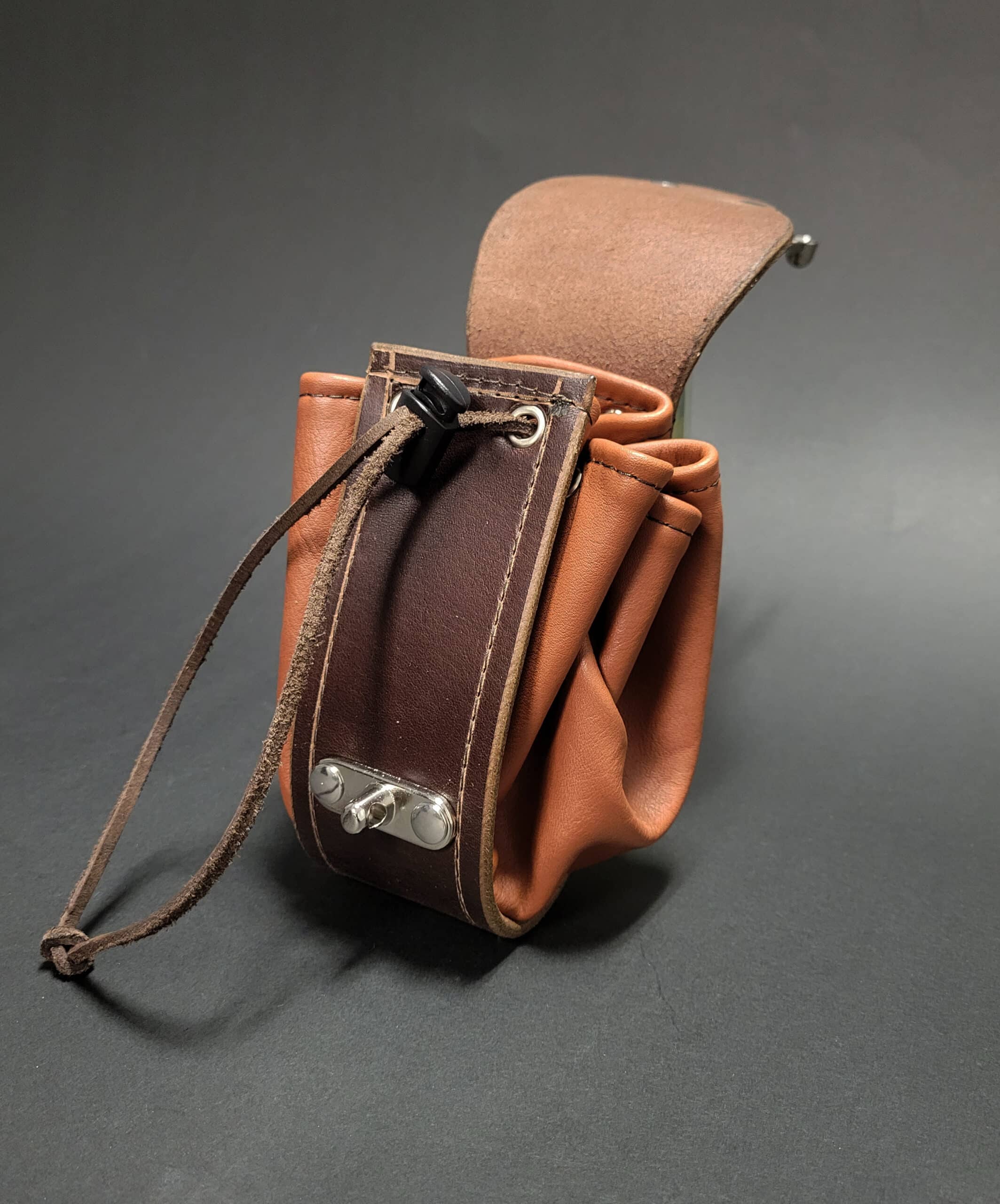 The main body of each bag is made of supple 2-3 ounce cowhide that cinches closed. the flap is 8-10 ounce latigo that closes via a metal swing clasp.