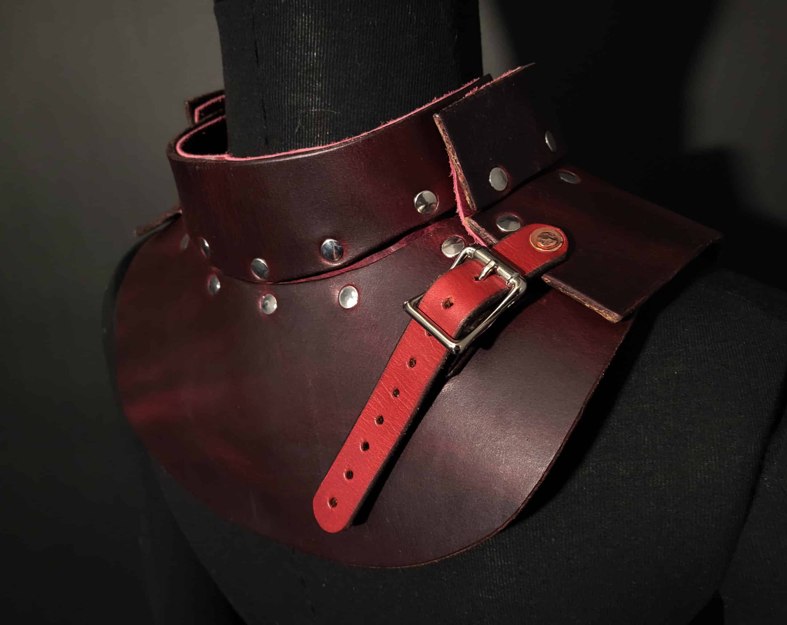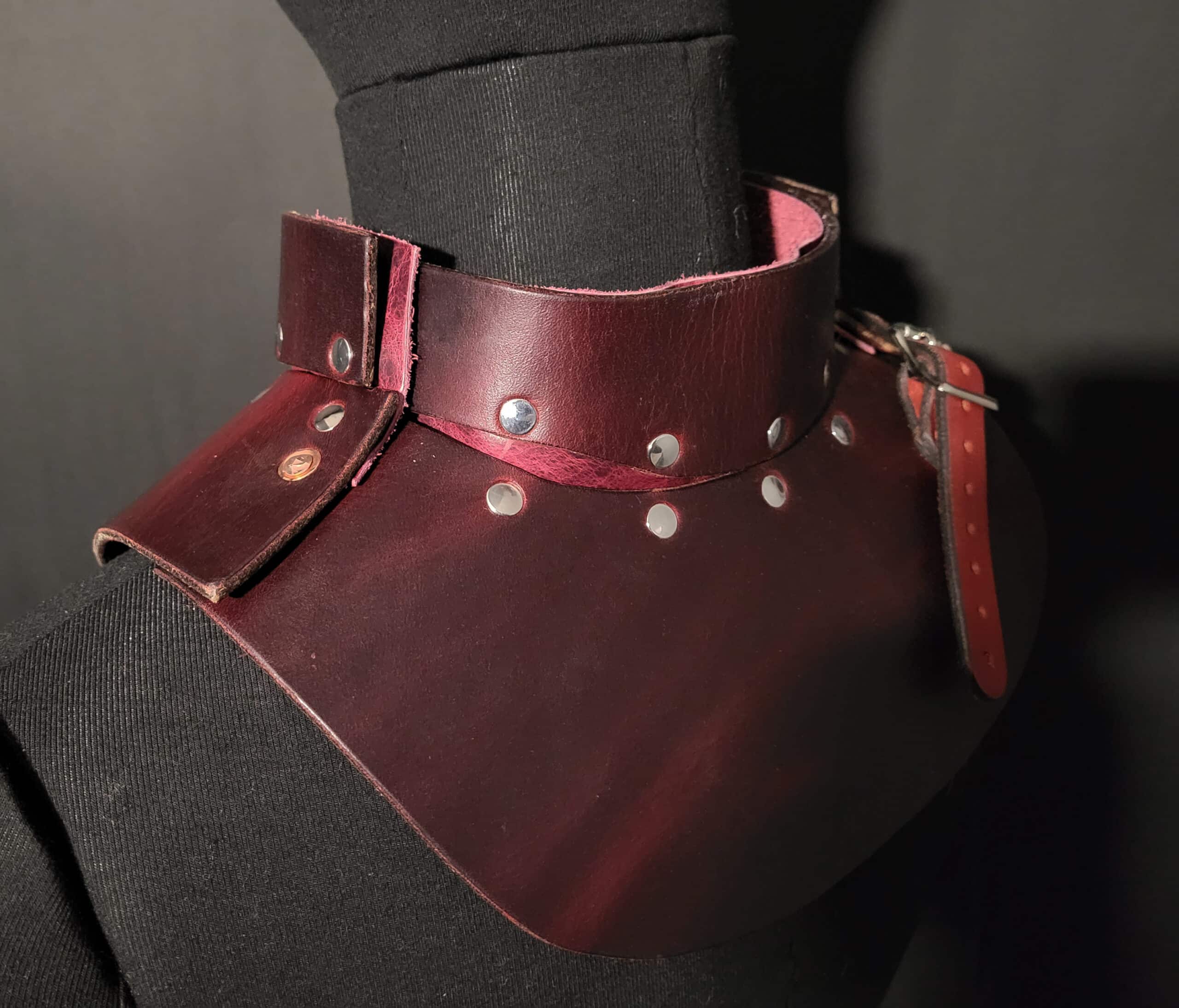 The gorget is made of 8-10 ounce latigo cowhide. The gorget covers a greater surface area than my other gorget option,and also features attachments for shoulder armor (my style 3 shoulders are shown in the photos) As with all my armor, the gorget has the option of being impregnated with wax, which dramatically increases the rigidity, and therefore the protection to function as armor in reenactment fighting, HEMA, LARP, or whatever your hobby happens to be.