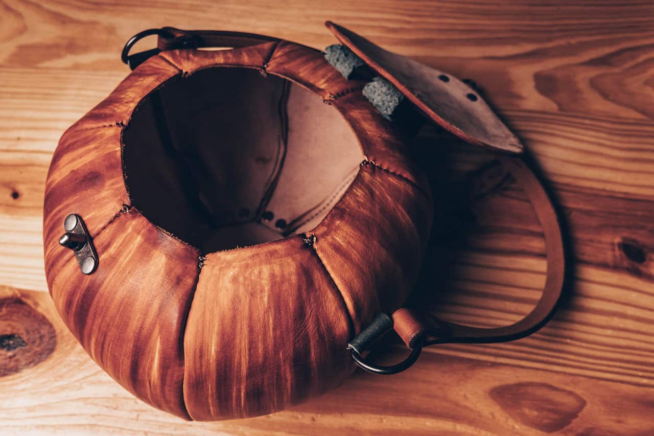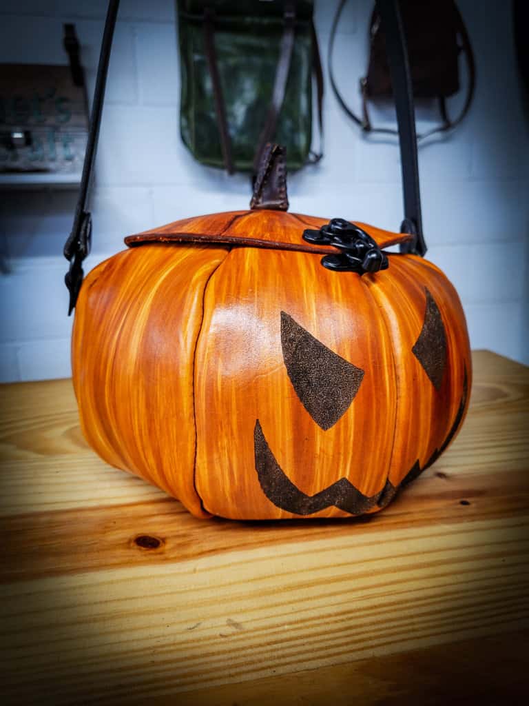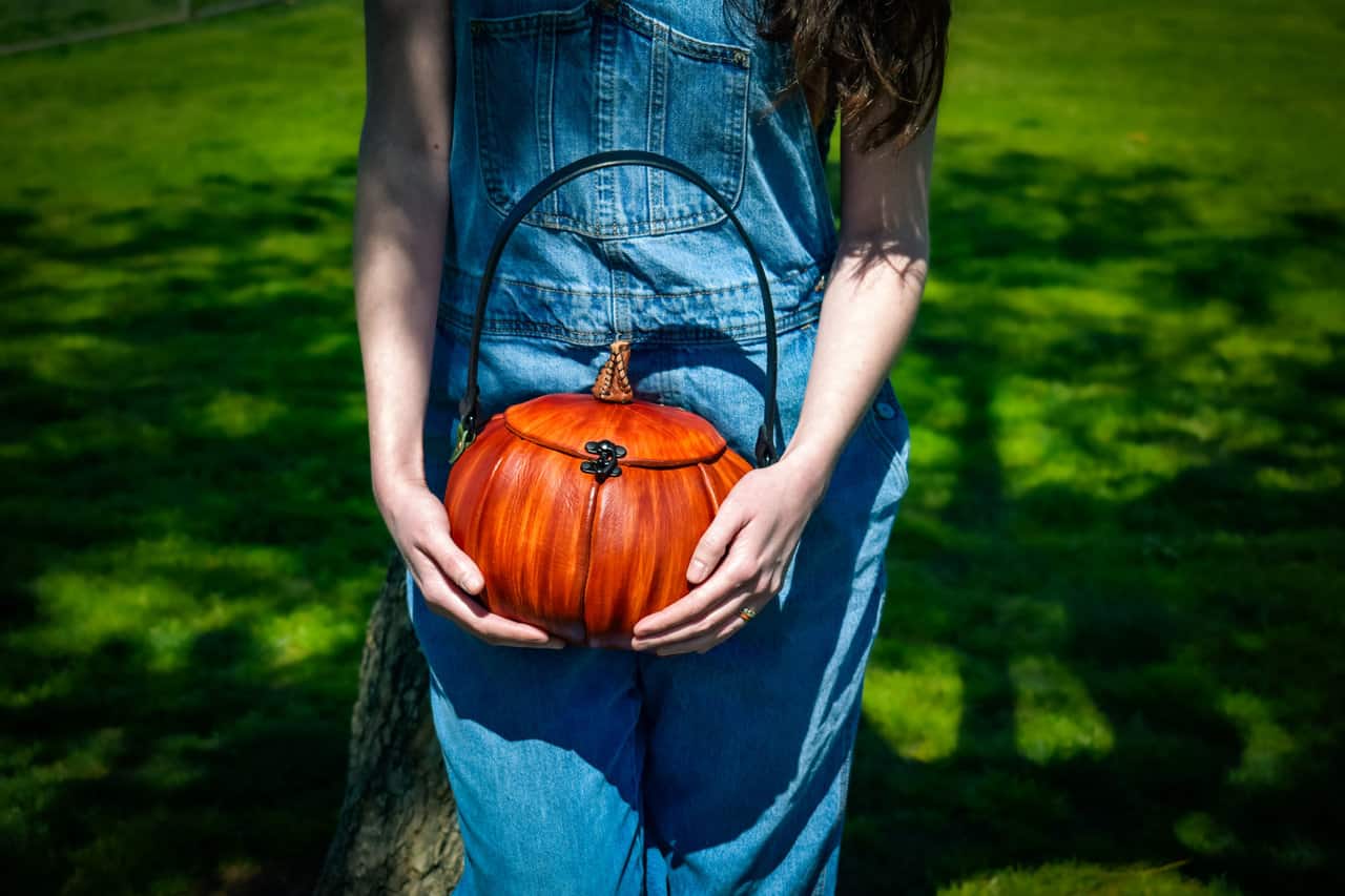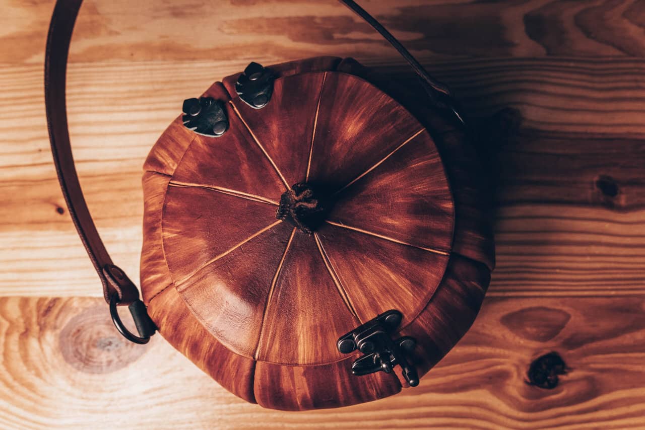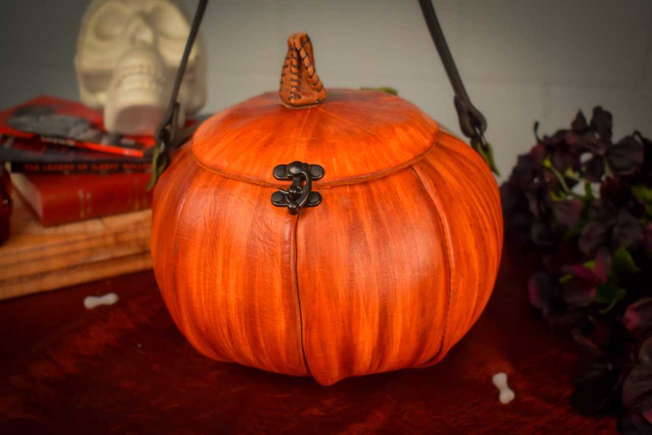 These are handmade leather bags, which are styled to resemble pumpkins or jack o’lanterns.