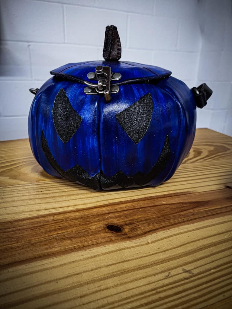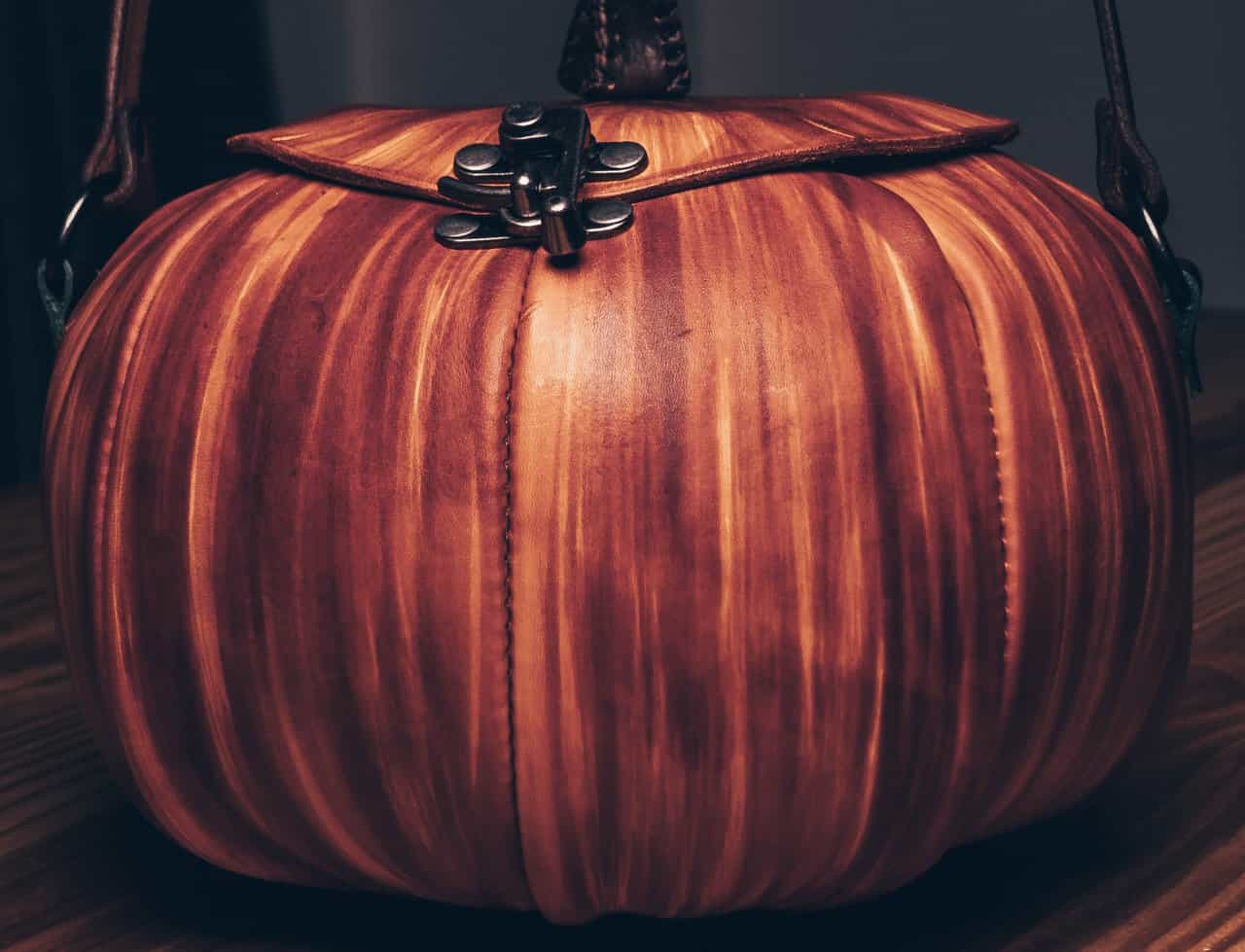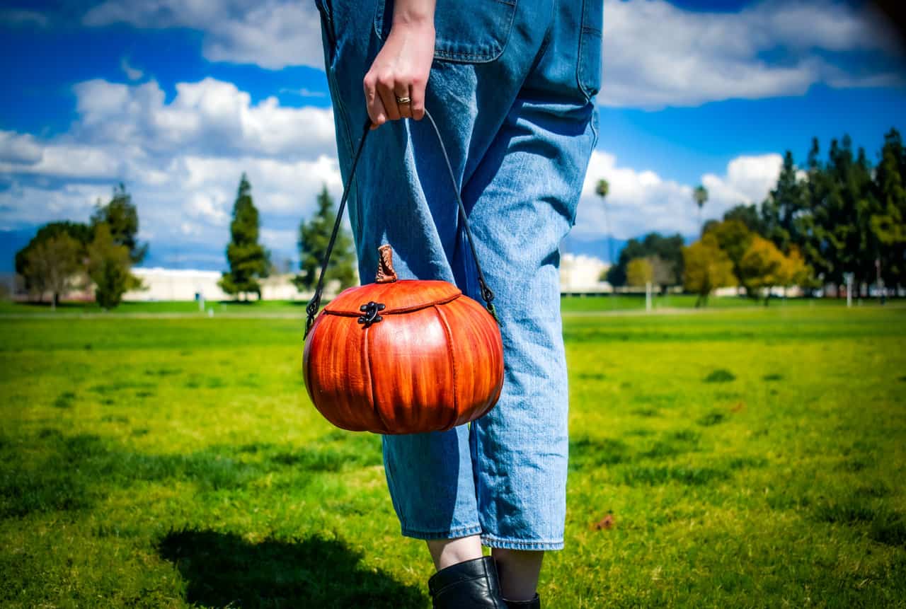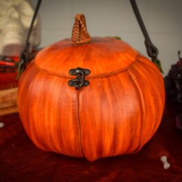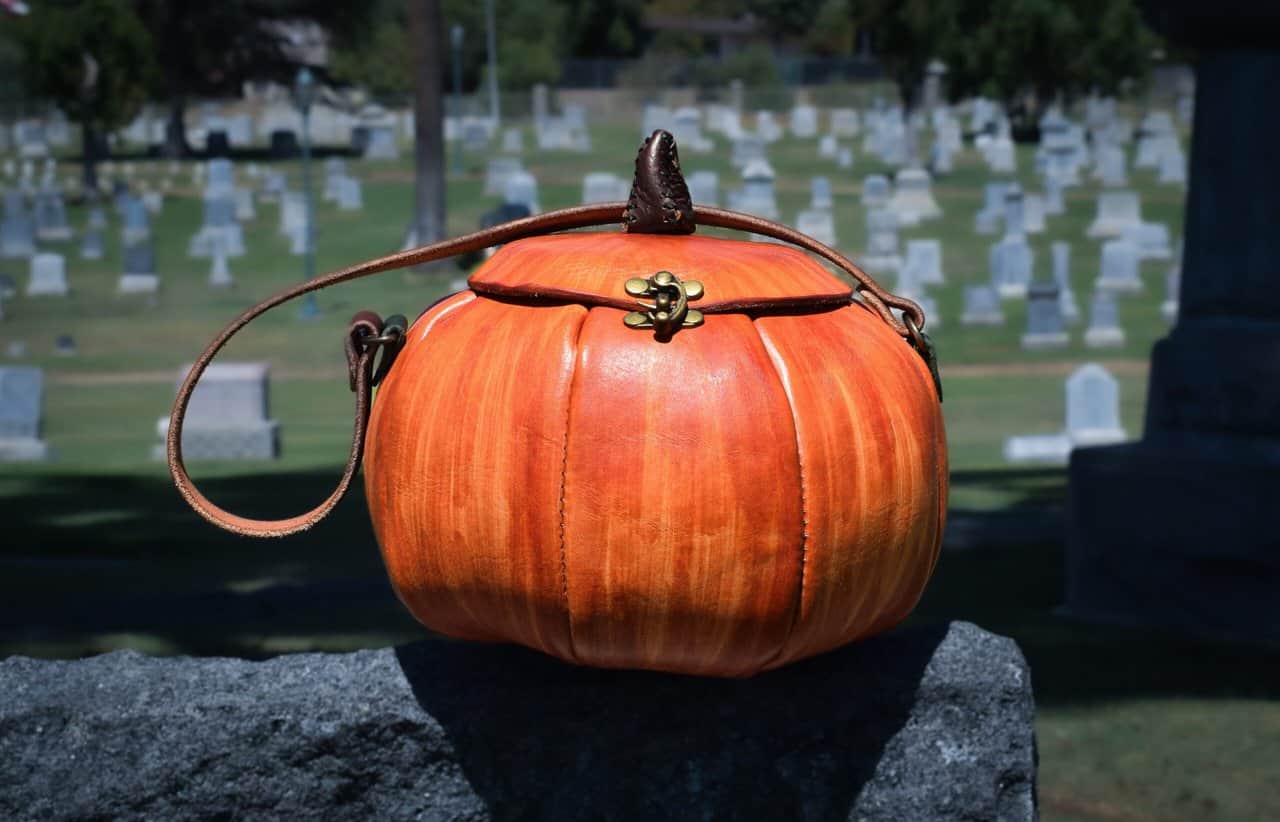 These are handmade leather bags, which are styled to resemble pumpkins or jack o’lanterns.