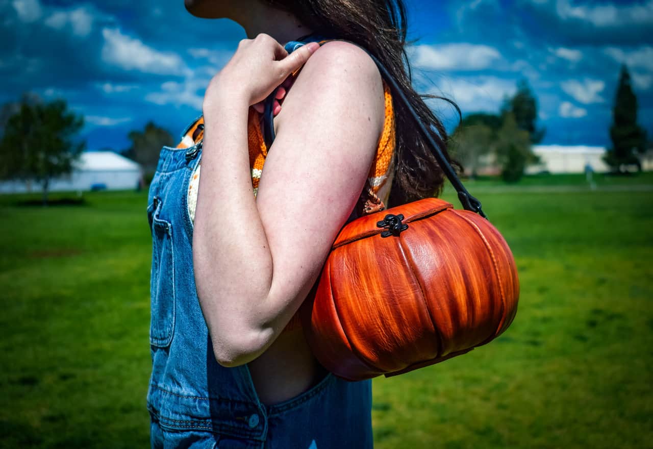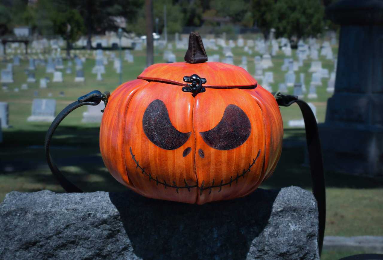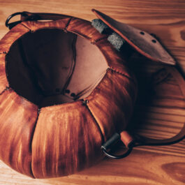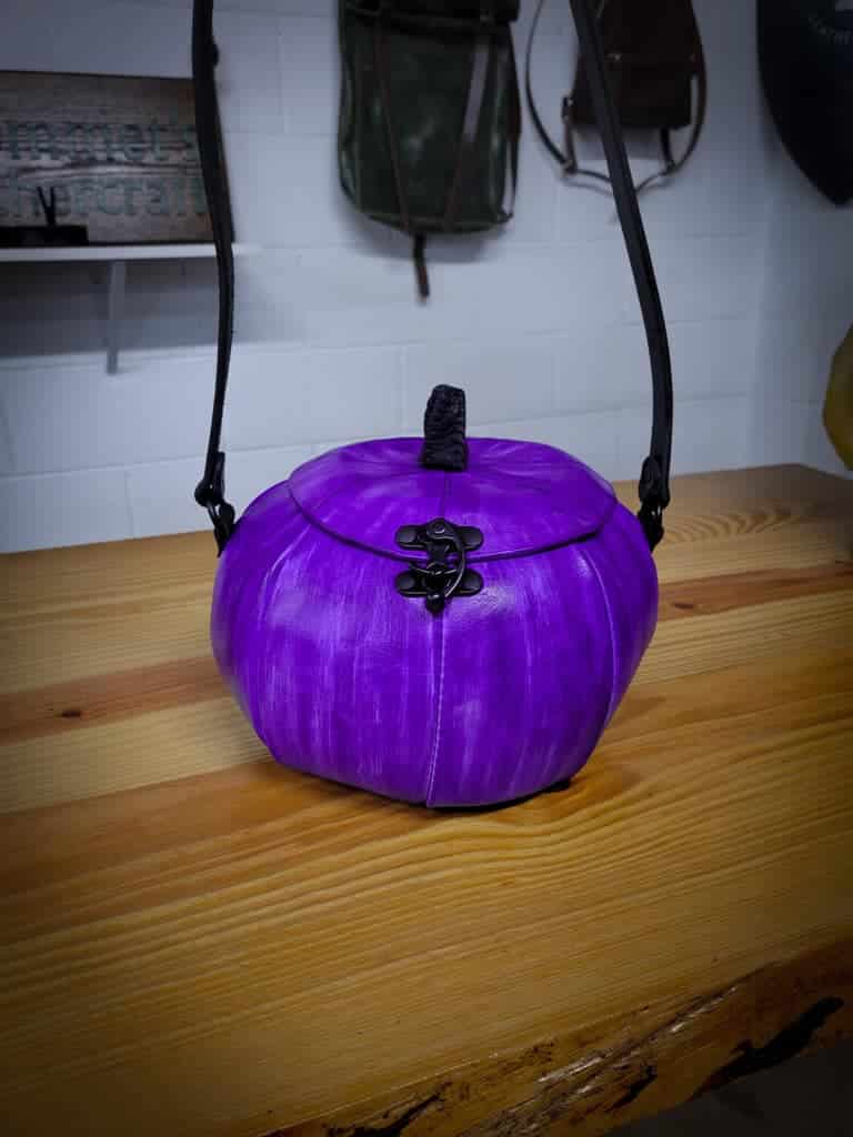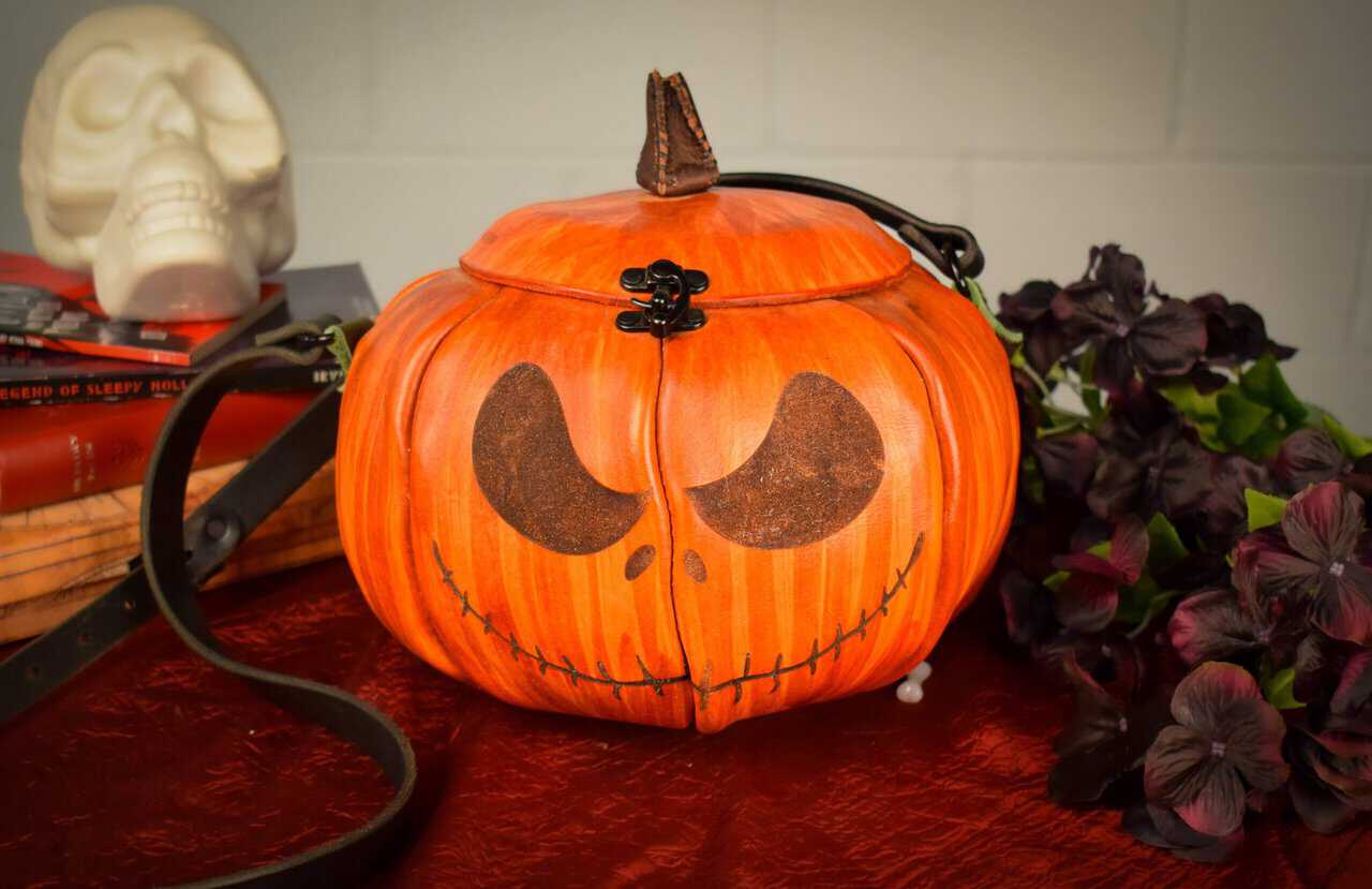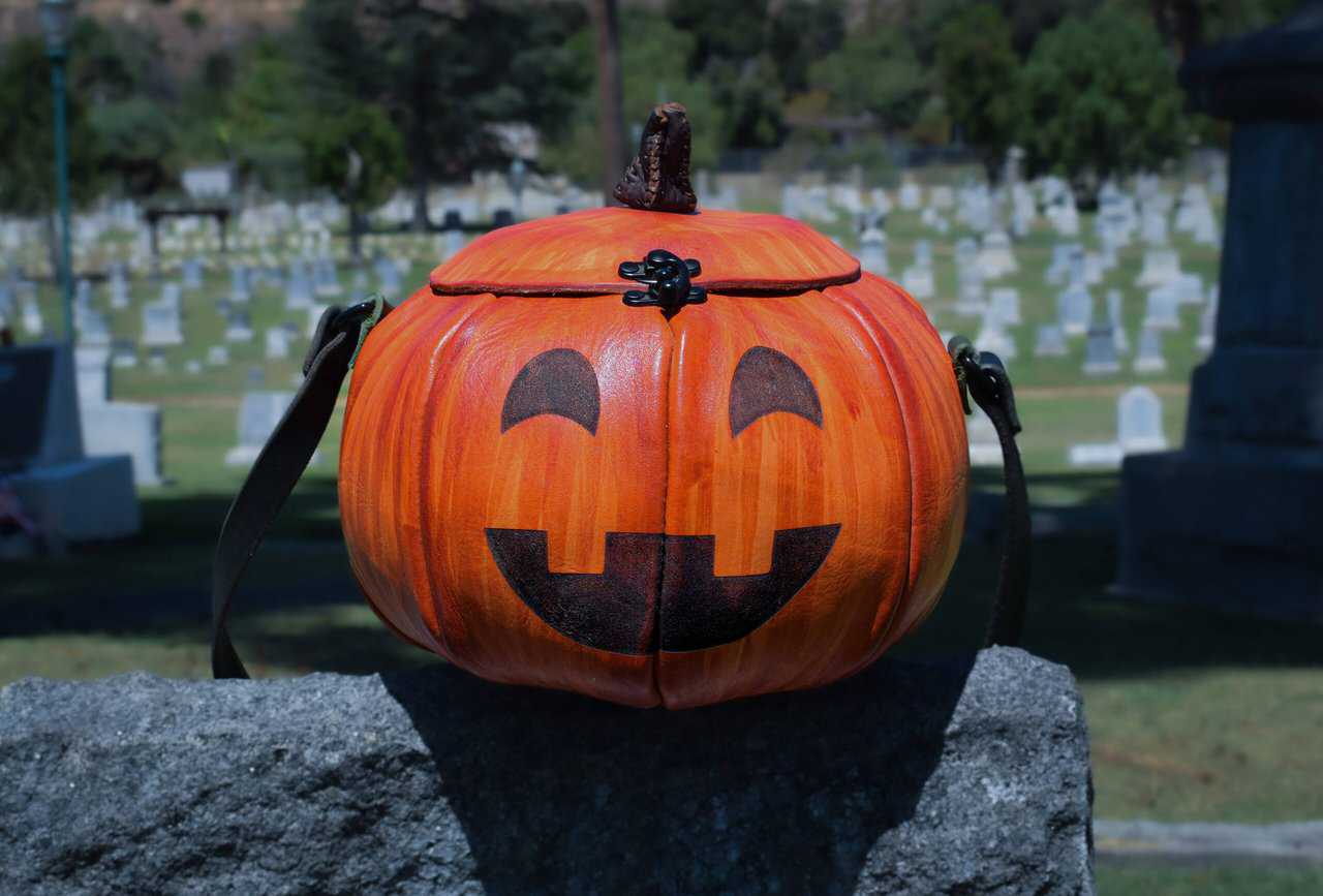 These are handmade leather bags, which are styled to resemble pumpkins or jack o’lanterns.