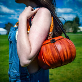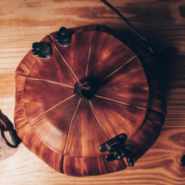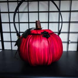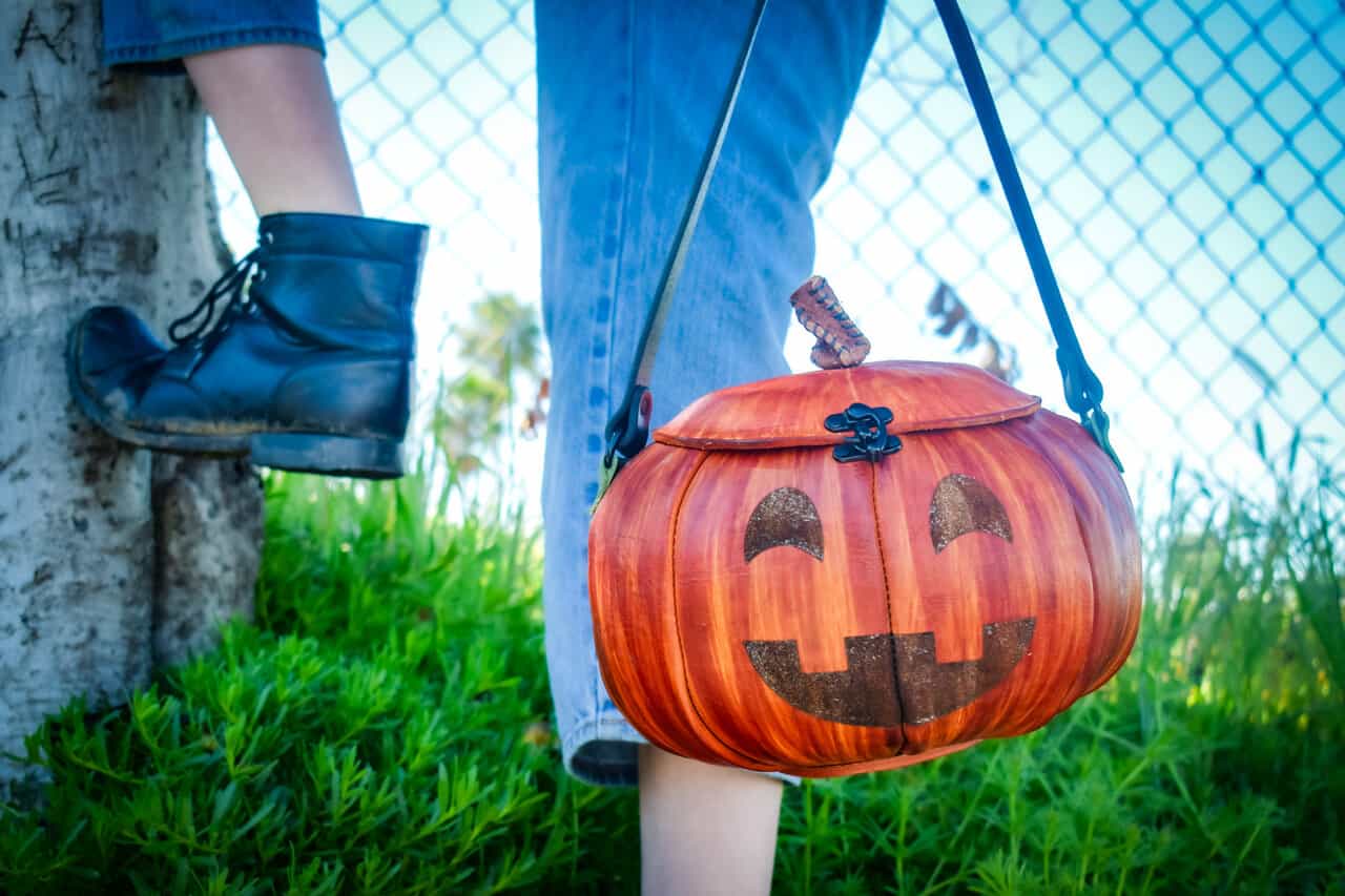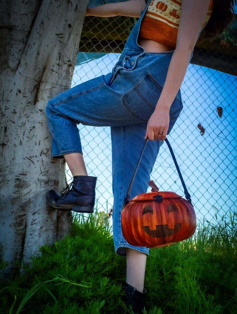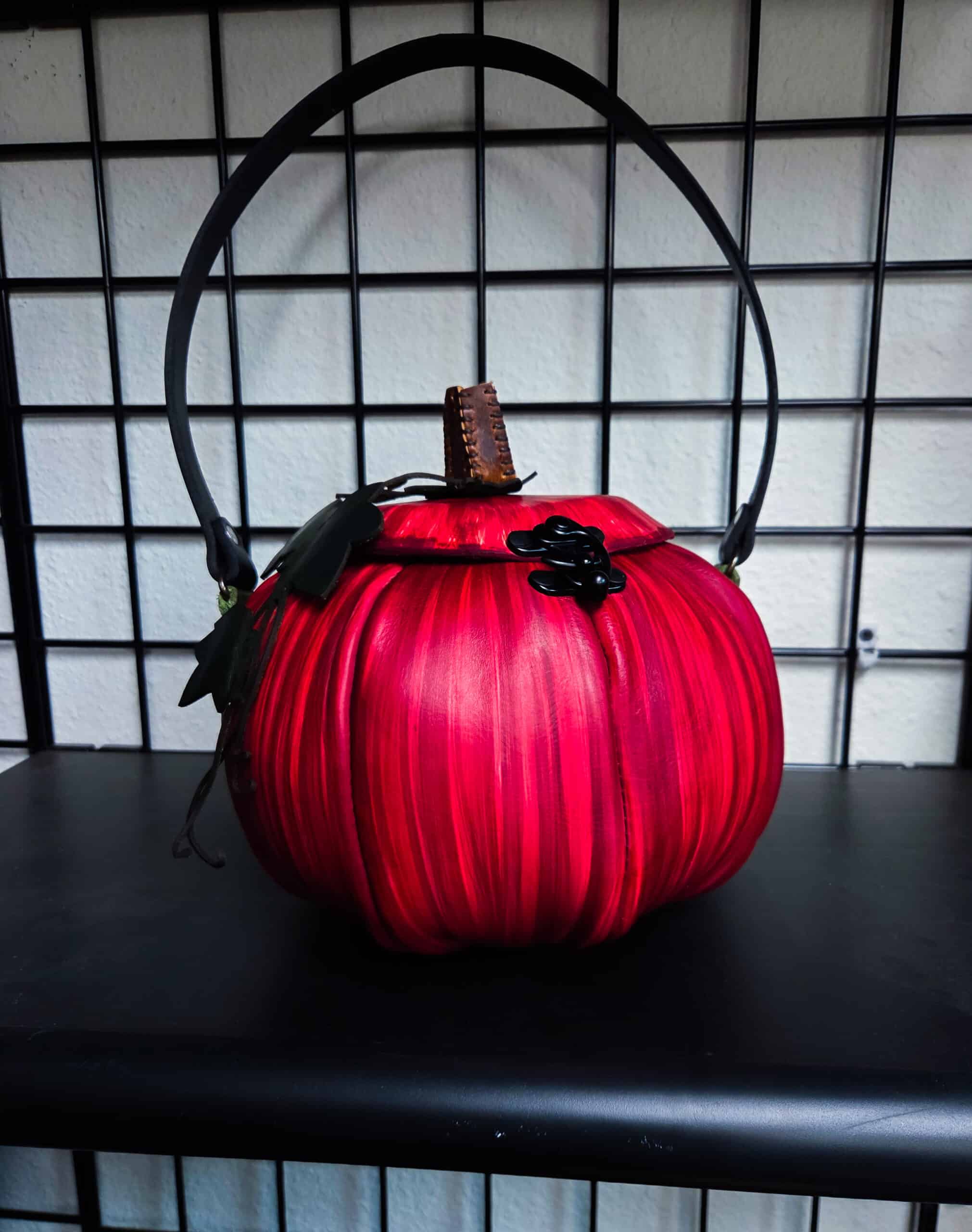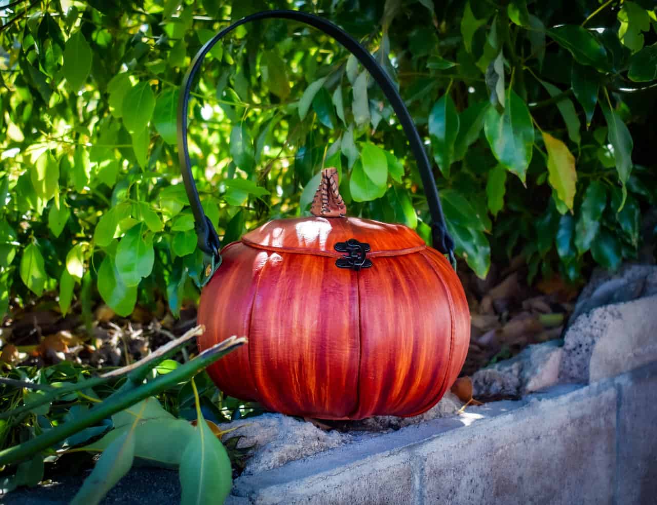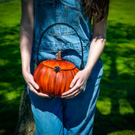 These are handmade leather bags, which are styled to resemble pumpkins or jack o’lanterns.