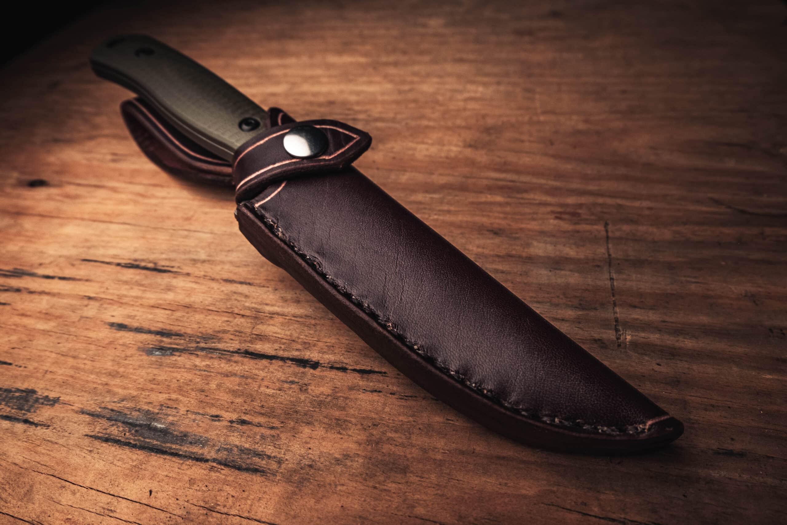 This is a handmade leather sheath for the Benchmade 539gy Anonimus.