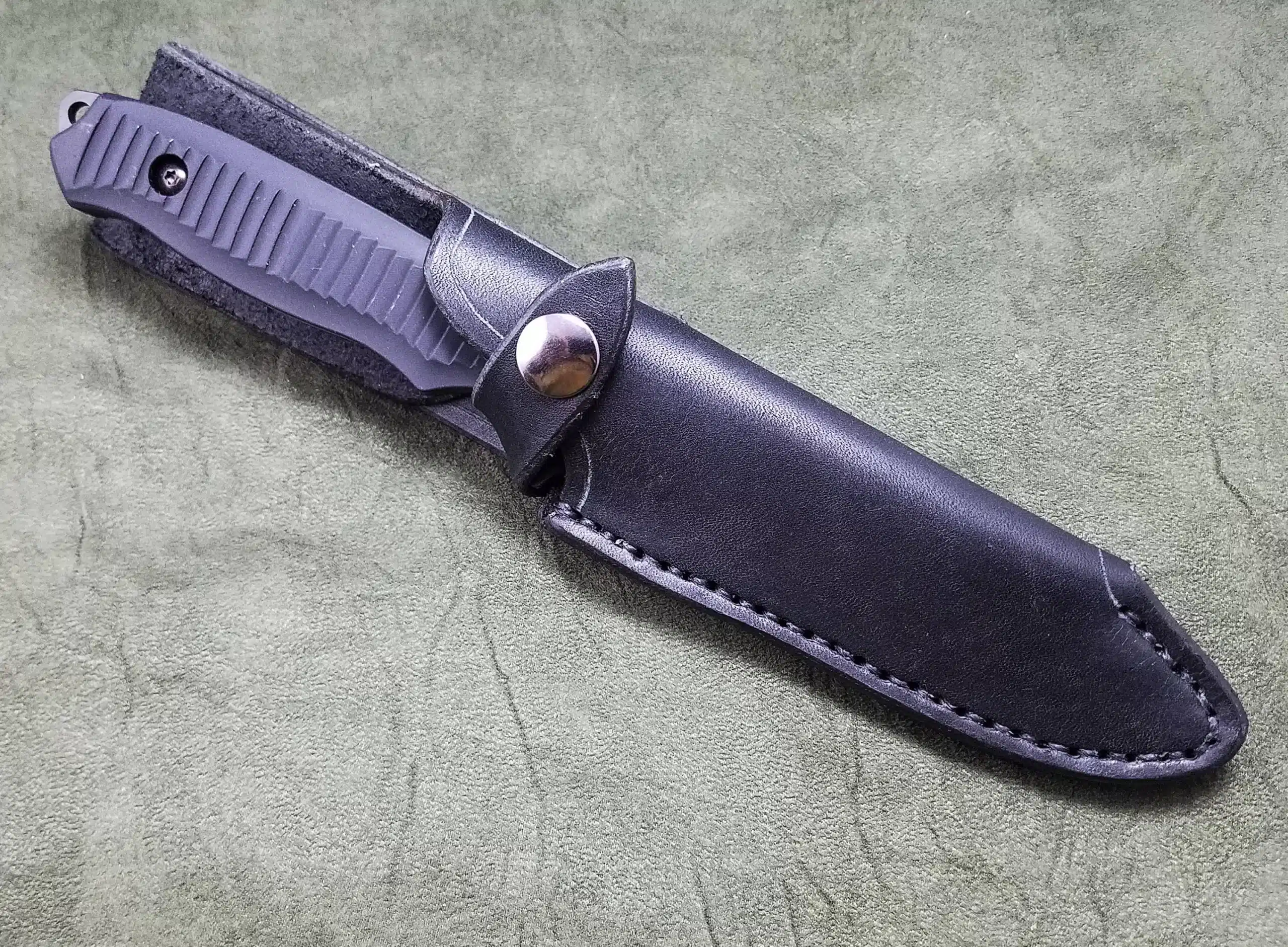 The sheath is hand stitched out of 8-10 ounce Latigo cowhide, unless the natural color is chosen, in which case it will be made out of 8-10 ounce vegetable tanned cowhide. It is available as a vertical or horizontal (scout style) sheath.