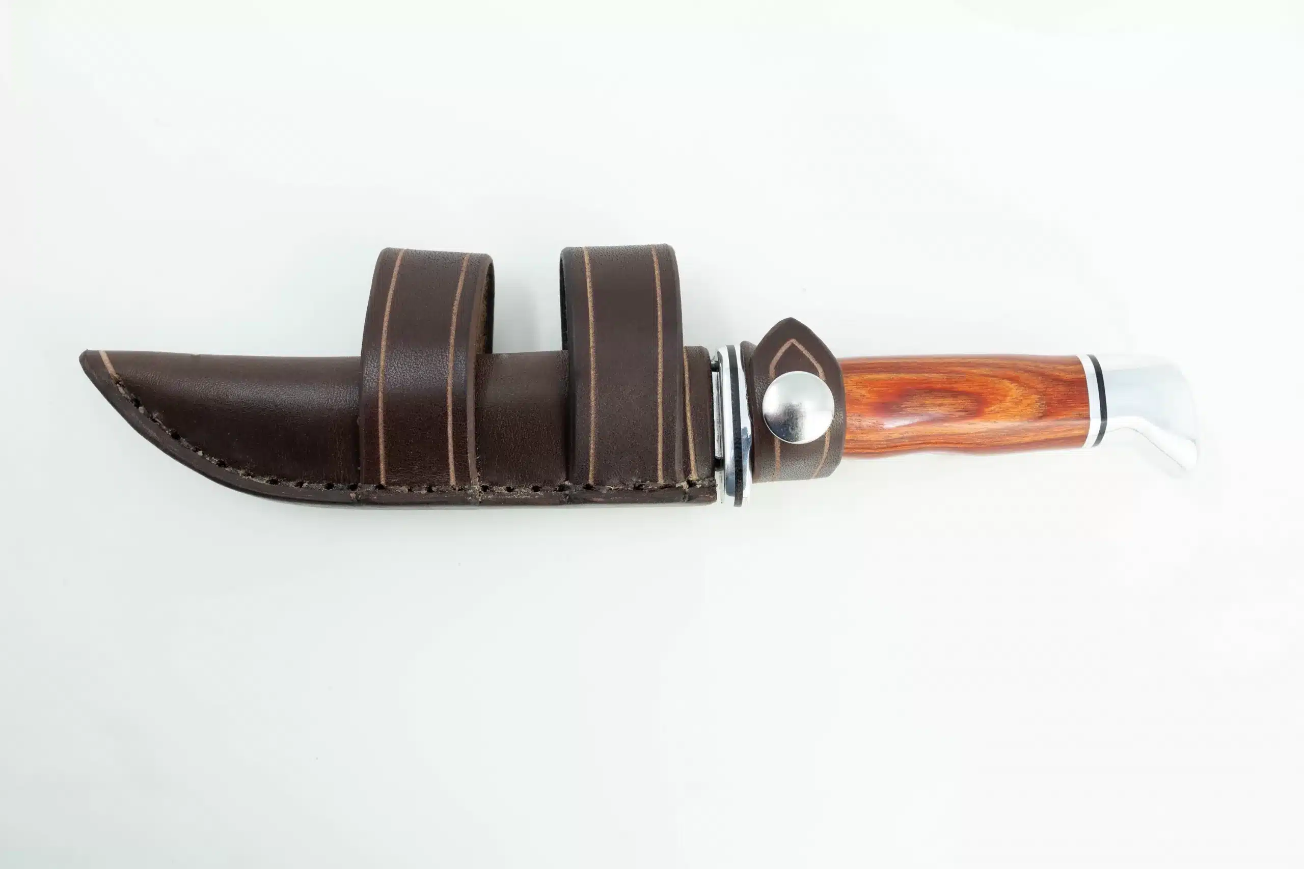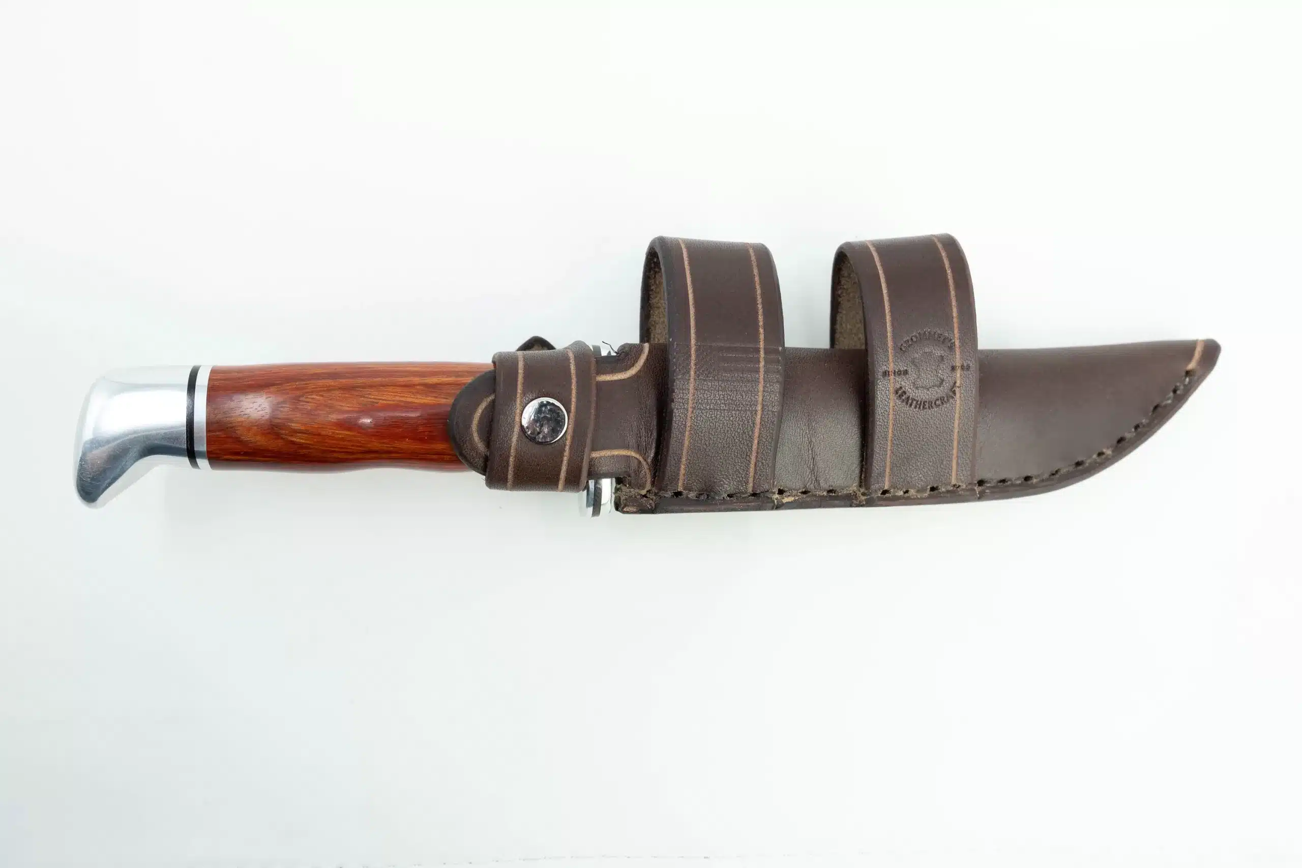 It is made out of 8-10 ounce latigo cowhide, and can be made with a vertical belt loop, or 2 1″ horizontal straps that snaps closed. Each option features a snap closure for the grip of the knife.