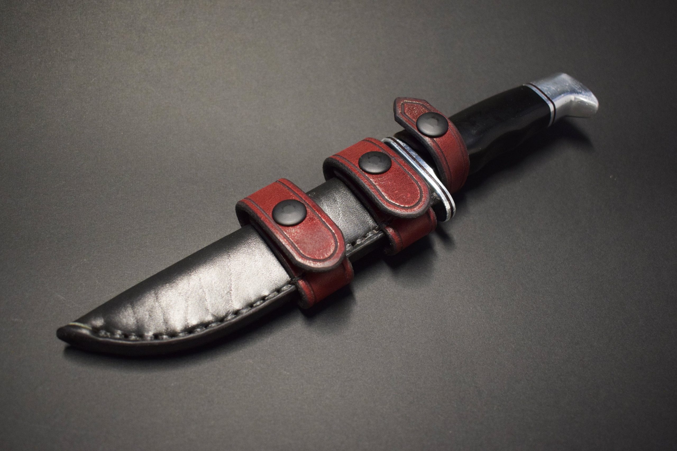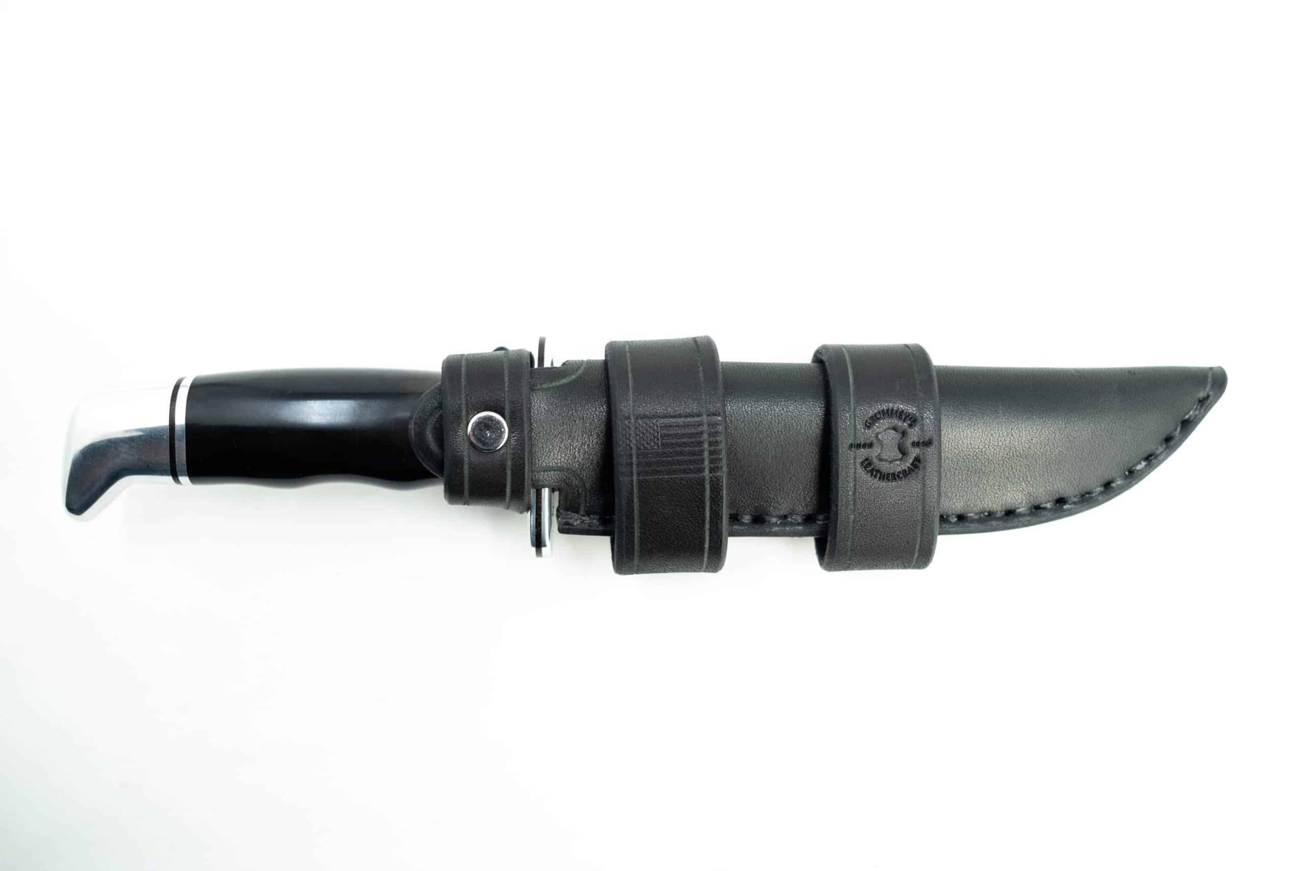 It is made out of 8-10 ounce latigo cowhide, and can be made with a vertical belt loop, or 2 1″ horizontal straps that snaps closed. Each option features a snap closure for the grip of the knife.