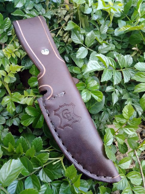 It is made out of 8-10 ounce latigo cowhide, and can be made in either vertical or horizontal carry. The “scout style” horizontal carry is designer to be worn in back, and drawn with whatever hand you choose. It features a 1.5″ wide strap that snaps closed to carry the knife horizontally on your belt The Ambidextrous version has a solid 1.5″ wide loop, which allows the knife to be drawn with the Right or Left hand, but does not unsnap, so must be threaded onto your belt. Each style comes with a snap closure loop around the grip of the knife.